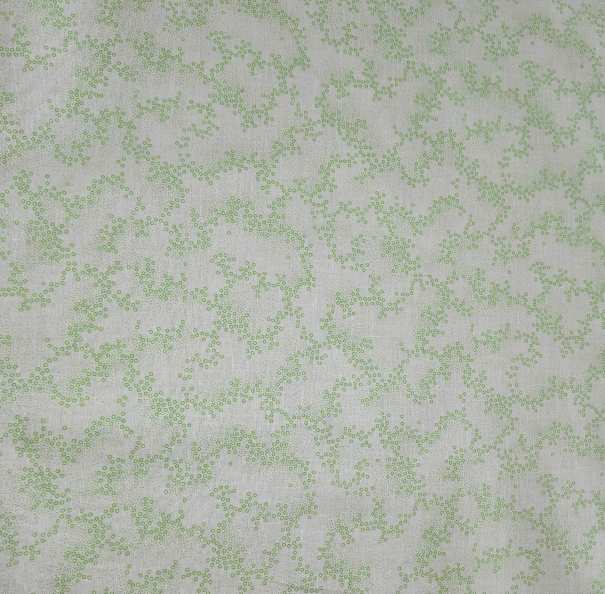 Une pluie de petits cercles vert clair se déploie sur un fond ivoire, légère et rythmée comme une brise sur la toile.