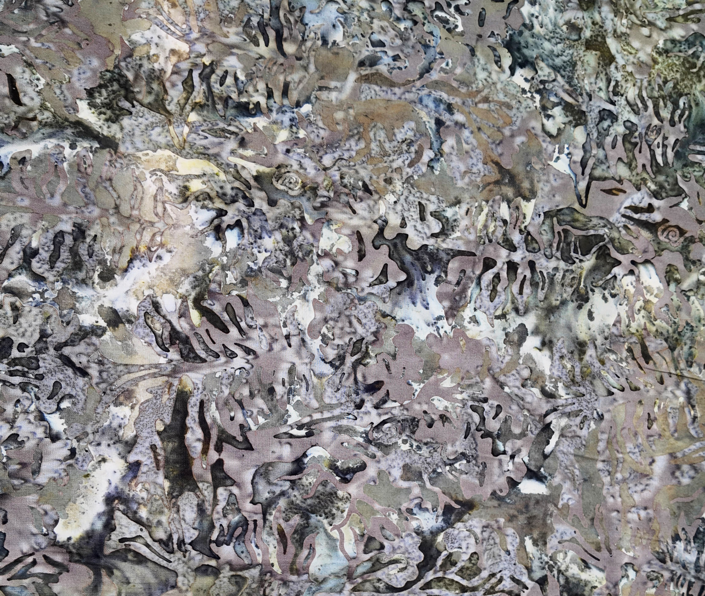 Des formes mouvantes d’ombre et de pierre s’entrelacent, rappelant la surface d’un rocher humide ou d’une écorce fossilisée.