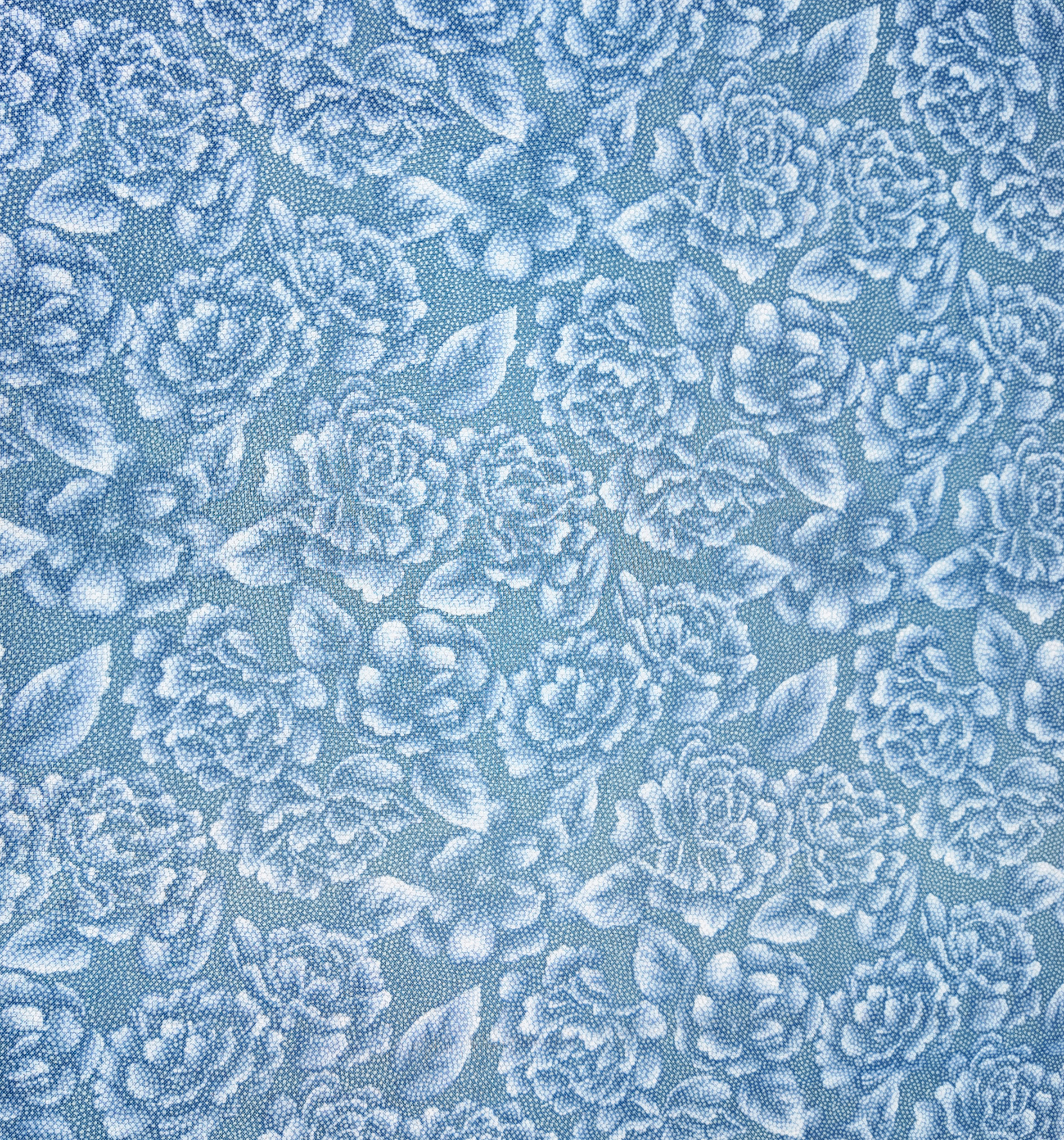 Des fleurs en relief d’un bleu givré se déploient sur un fond poudré, rappelant une dentelle glacée.