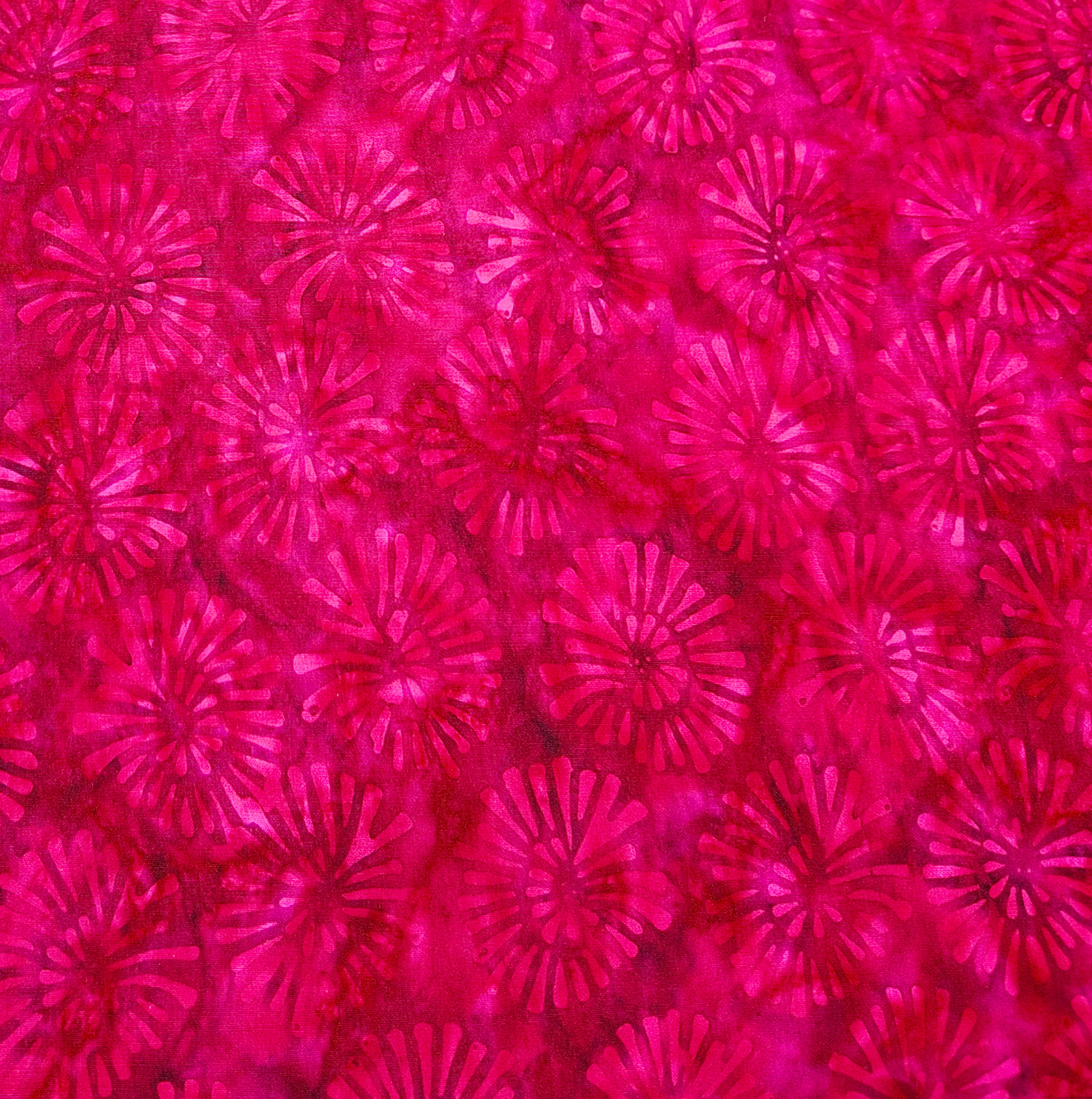 Sur un fond fuchsia vibrant, des gerbes florales stylisées explosent comme de petits feux d’artifice.