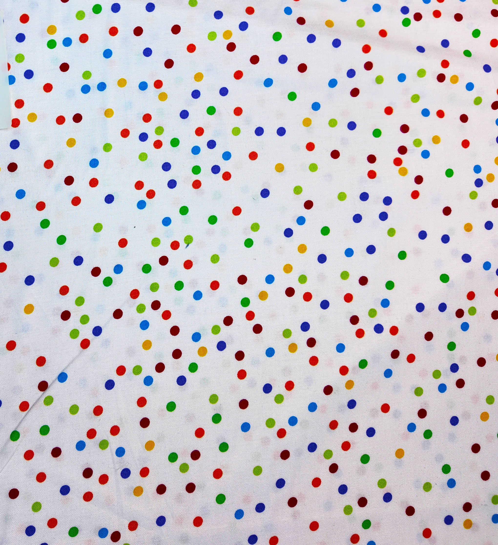 Sur un fond blanc, une pluie de pois multicolores évoque la joie simple des fêtes foraines.