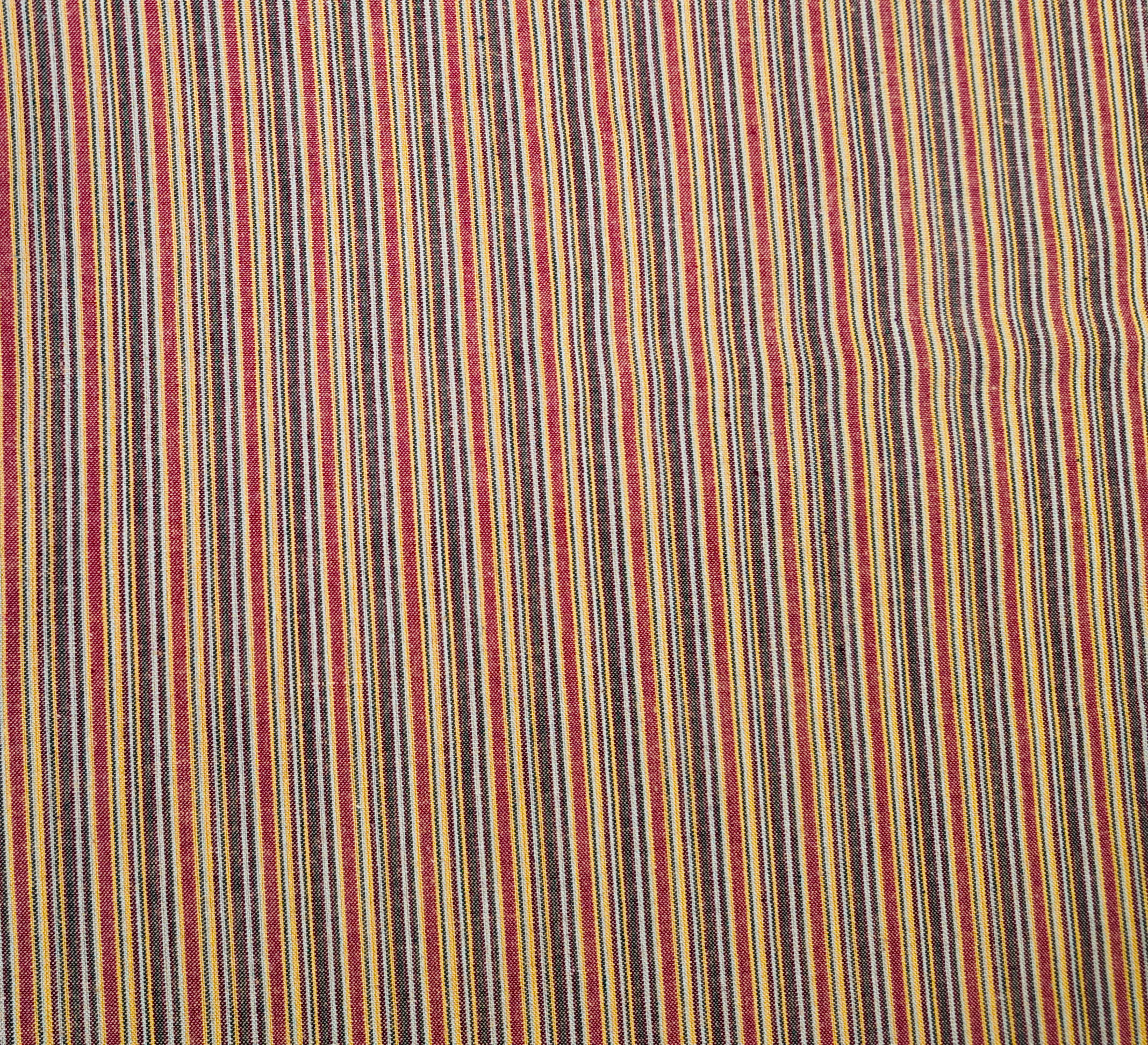 Une trame serrée de rayures jaunes, rouges et brunes évoque les marchés d’été et la chaleur des étoffes anciennes.