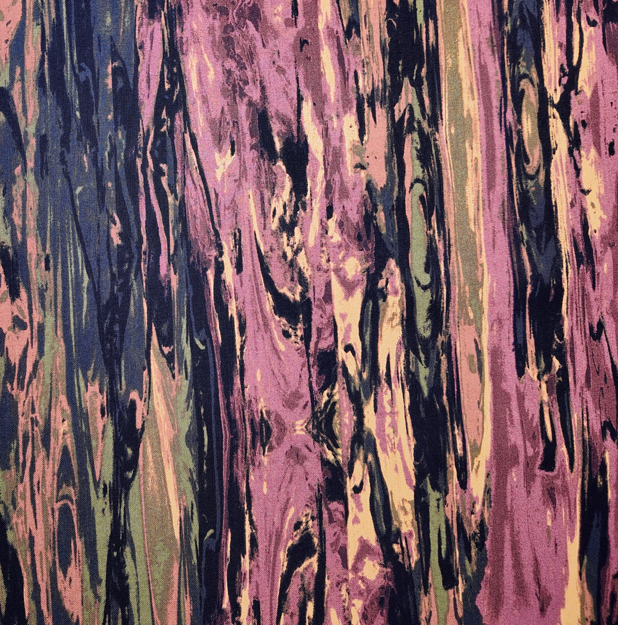 Des coulées de mauve, d’ocre et de vert s’allongent en nappes verticales, rappelant des écorces traversées de reflets sombres.