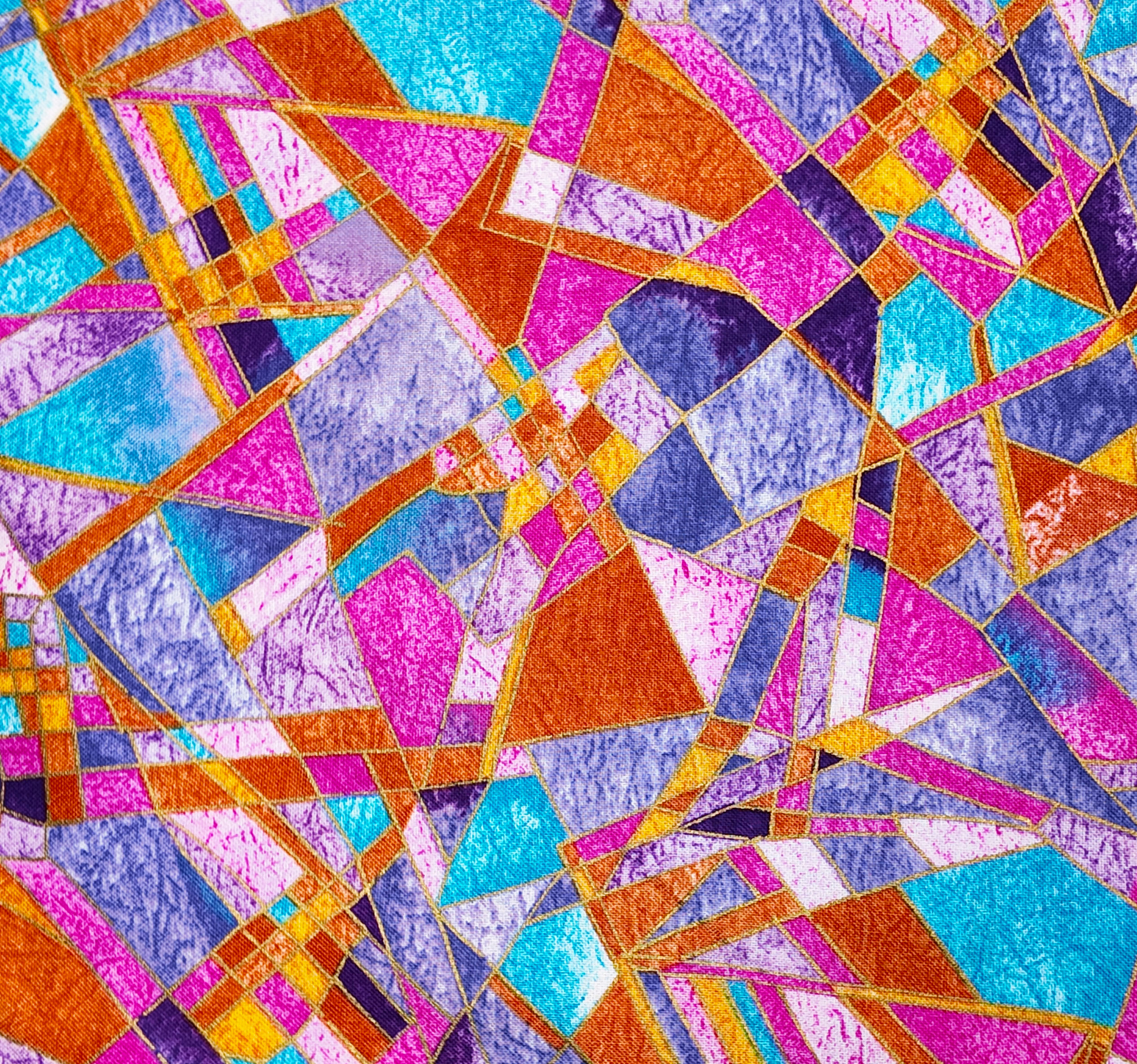 Des éclats géométriques de rose, turquoise et ocre s’imbriquent comme des vitraux éclatants de lumière.