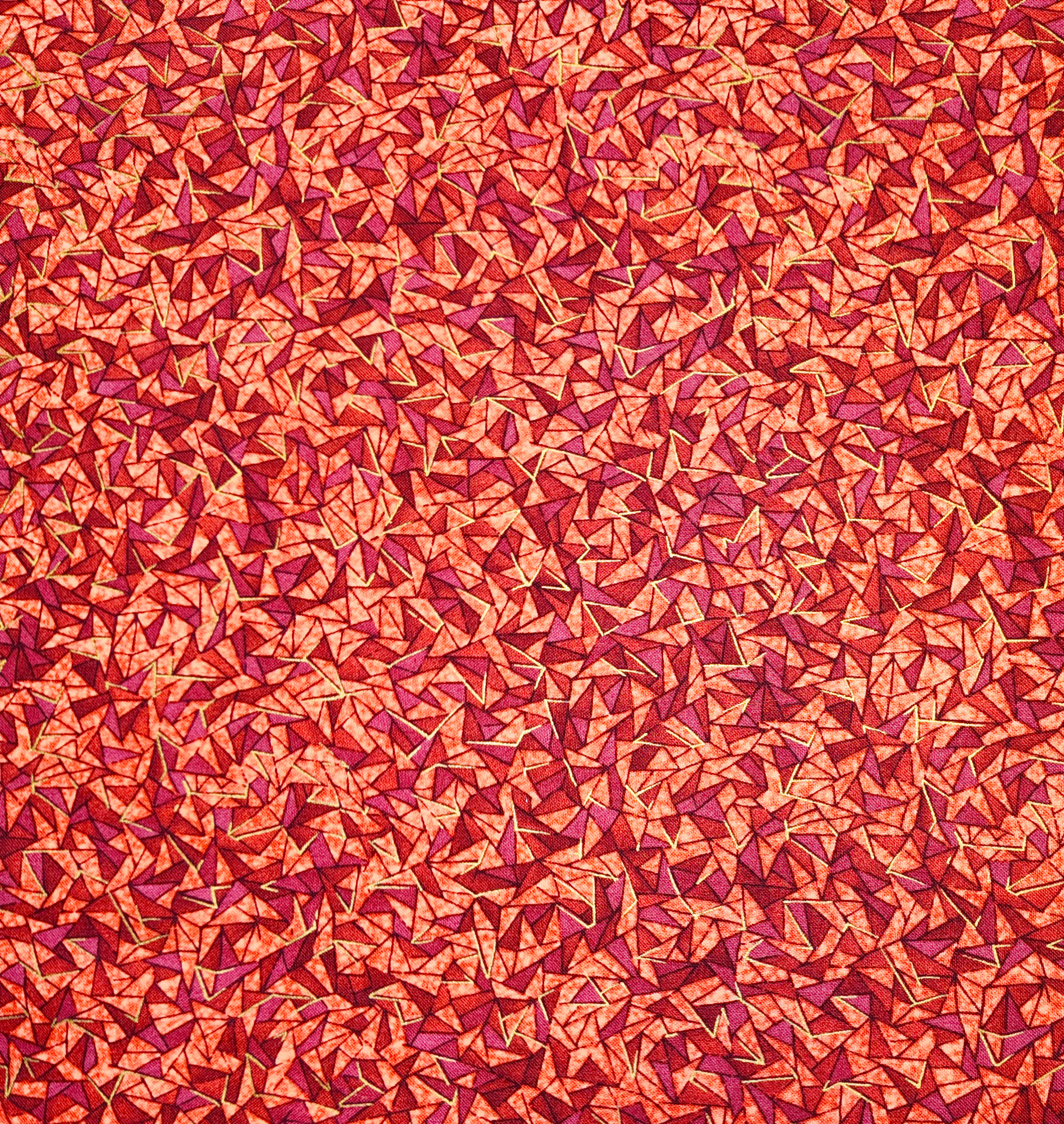 Une multitude de fragments rouges et roses s’emboîtent comme des éclats de verre, créant un relief dynamique.