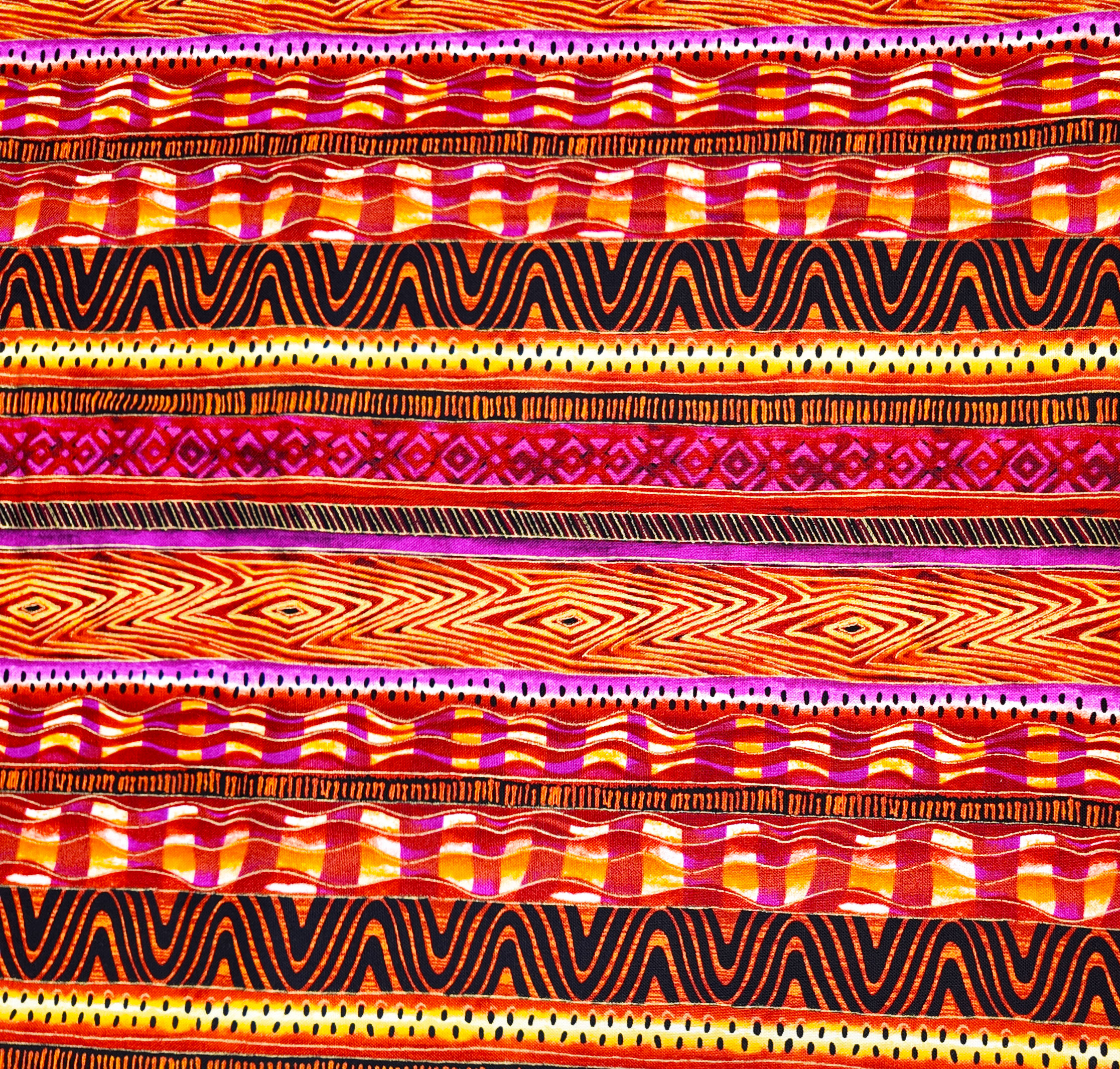 Des bandes ardentes d’orange, rouge et noir alternent en motifs tribaux, créant une vibration éclatante.