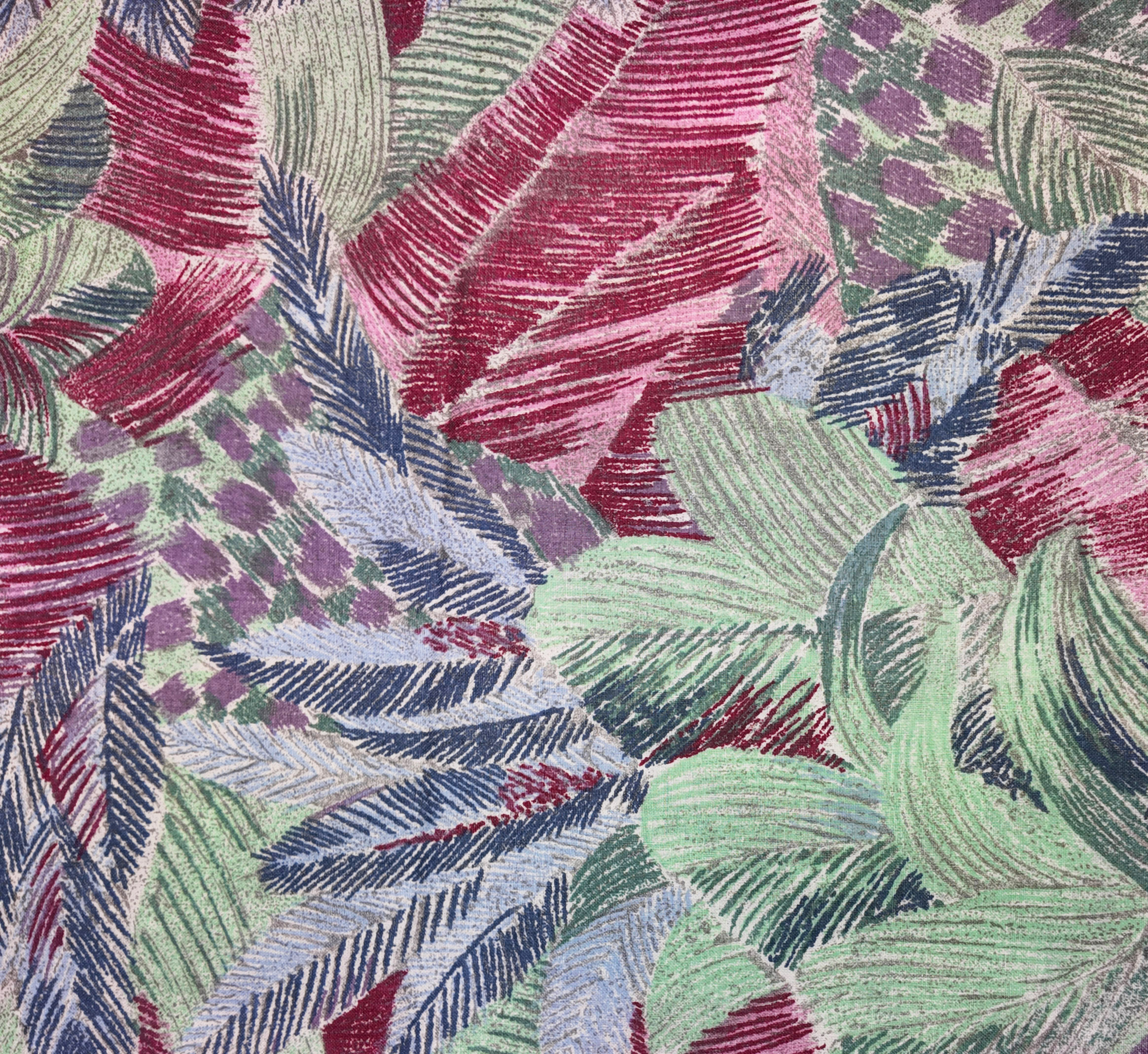 De larges feuilles vertes, rouges et bleutées se croisent en un tissage foisonnant, comme un jardin dessiné à la craie.