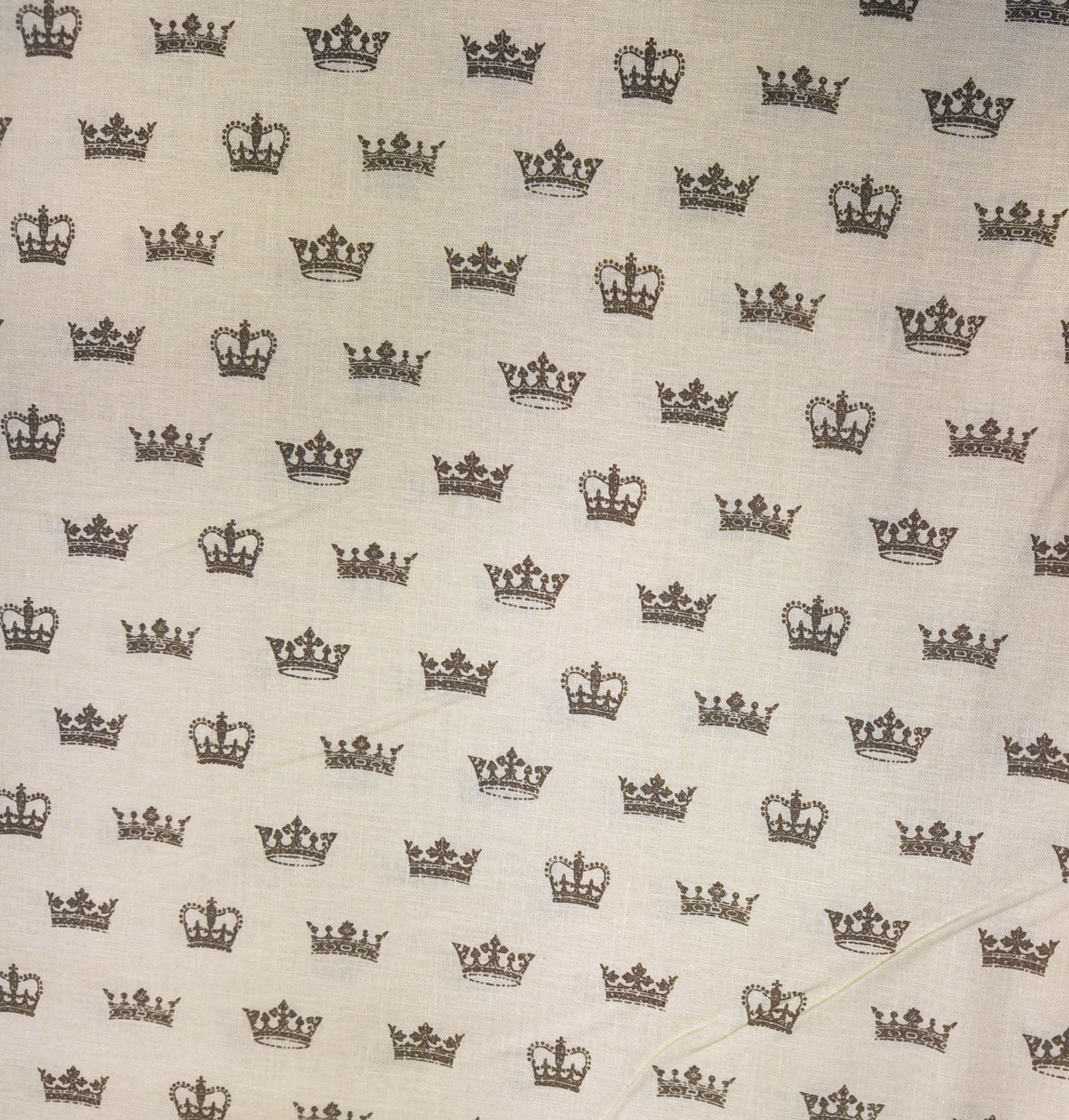 De petites couronnes brunes se répètent sur fond beige, évoquant un motif royal au charme ancien.