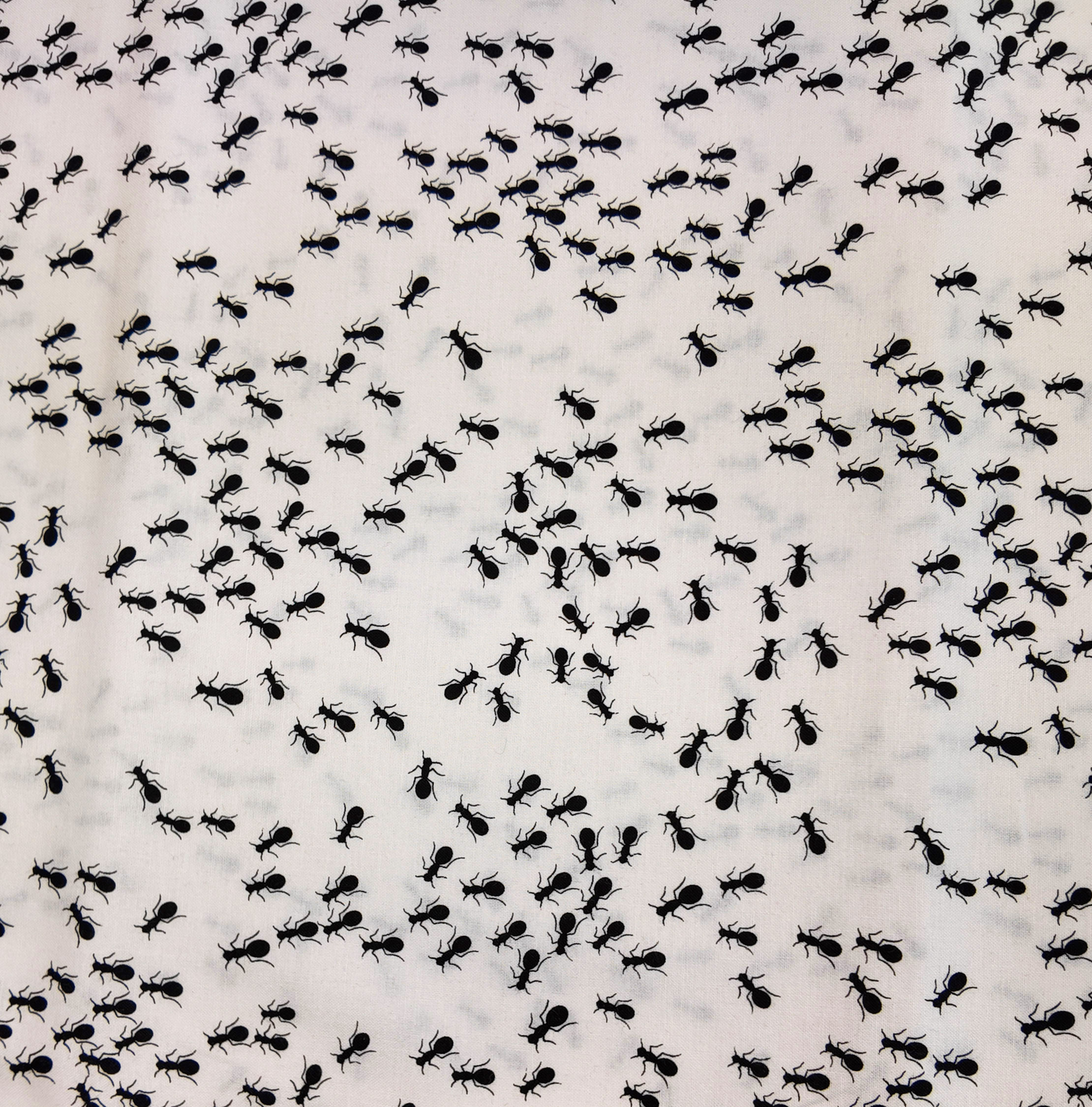 Une nuée de fourmis noires se déploie sur fond blanc, dessinant un ballet d’insectes en mouvement.