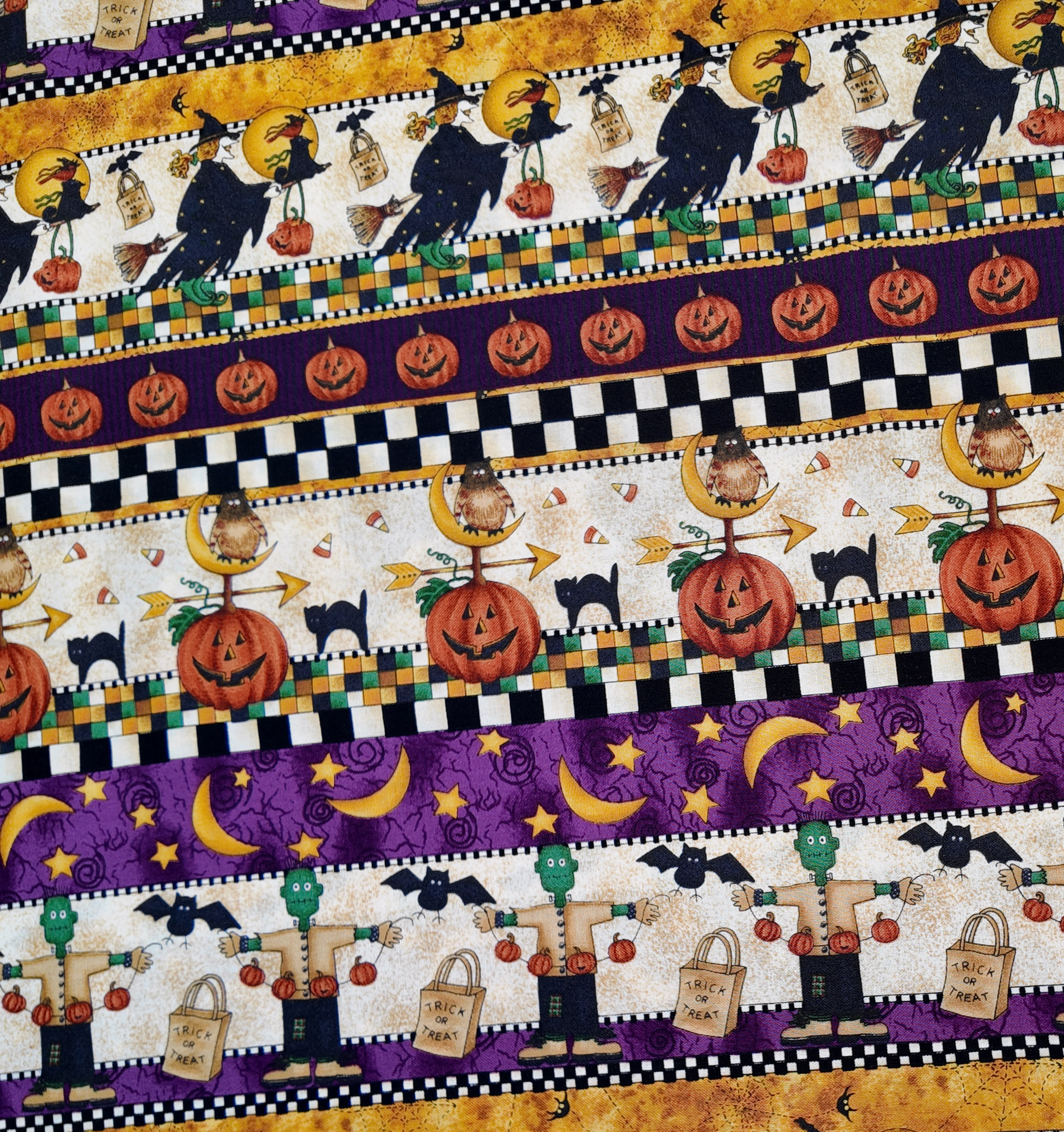 Des bandes festives alternant sorcières, citrouilles et lunes dorées, évoquent une joyeuse farandole d’Halloween sous un ciel étoilé.