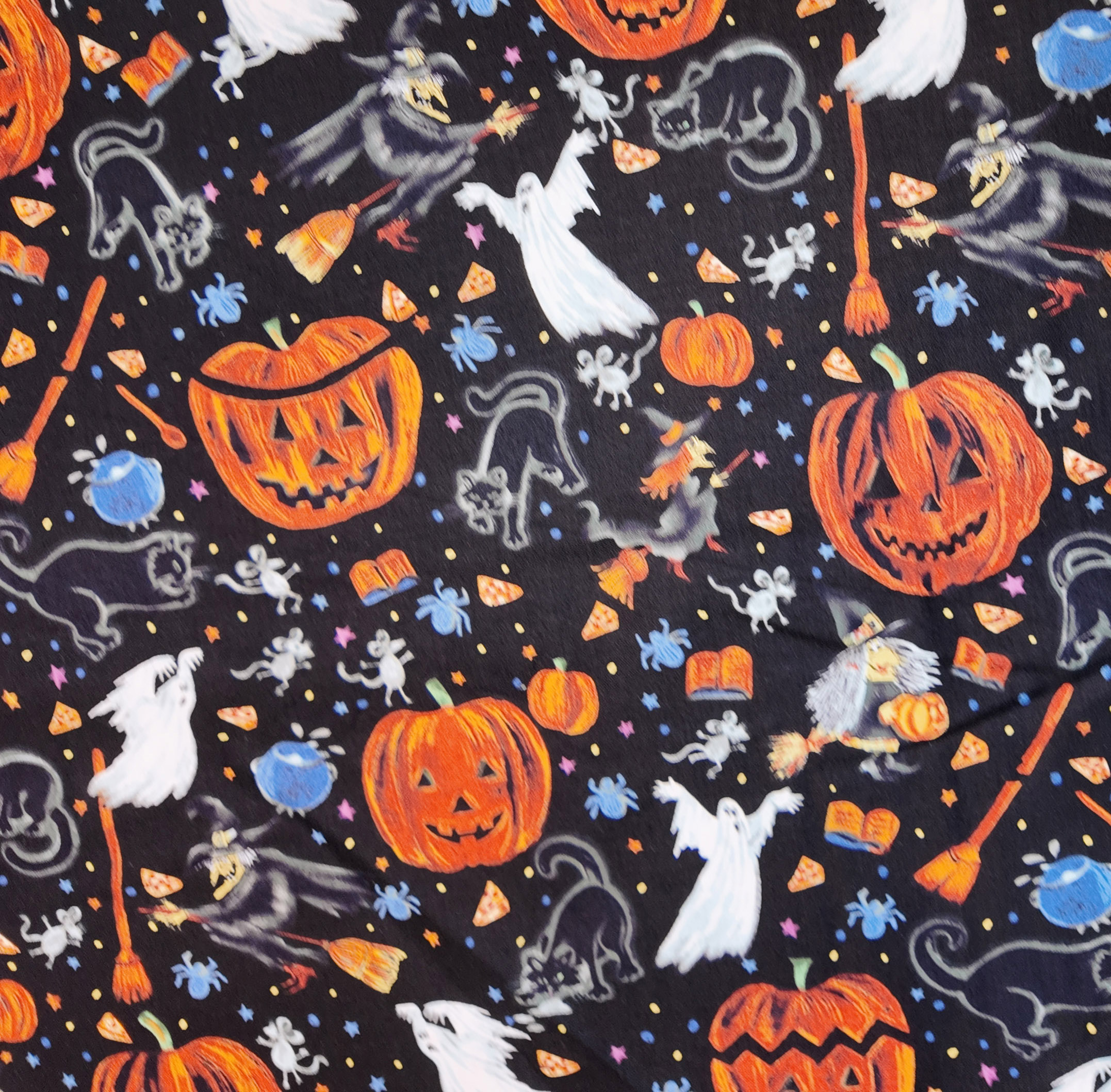 Citrouilles lumineuses, chats noirs et fantômes voltigent sur un fond nocturne parsemé d’étoiles et de friandises d’Halloween.