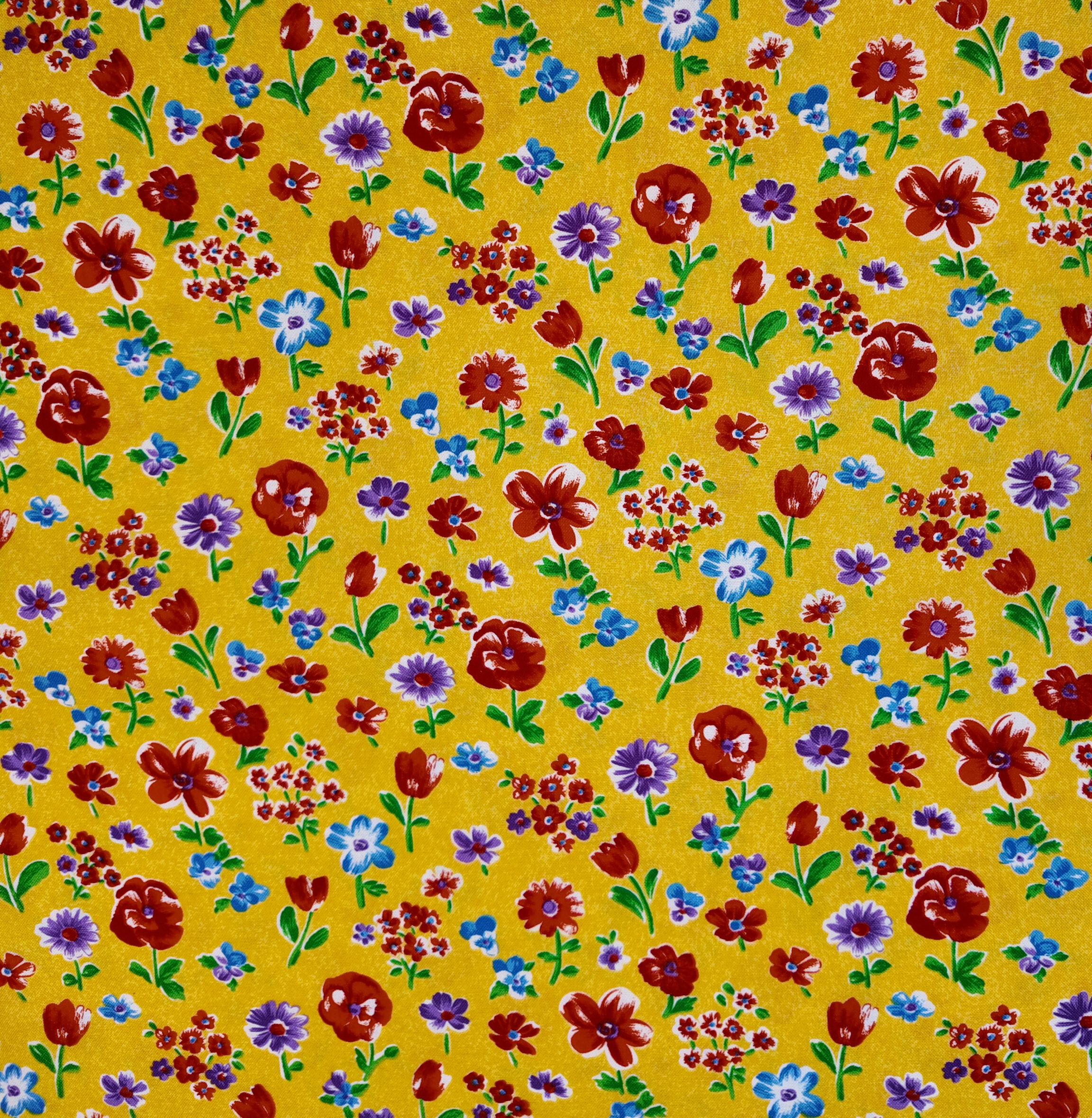 Une prairie éclatante s’étale sur fond jaune, où chaque fleur semble chanter l’arrivée du printemps. Les rouges, bleus et violets s’entrelacent dans une danse joyeuse, ponctuée de feuillages verts comme des éclats de fraîcheur. Ce tissu rayonne d’énergie florale, une fête visuelle qui invite à la légèreté.