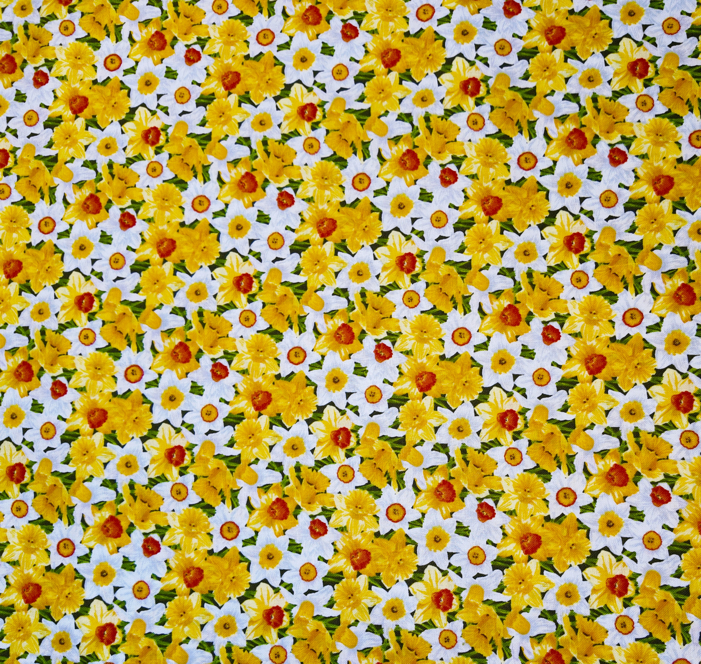 Une prairie de jonquilles s’étale en nappes serrées : corolles blanches et jaunes s’entrelacent, ponctuées de cœurs orange-rouille. L’ensemble respire la fraîcheur du printemps et invite au toucher soyeux. Motif petit et dense, gai et lumineux.