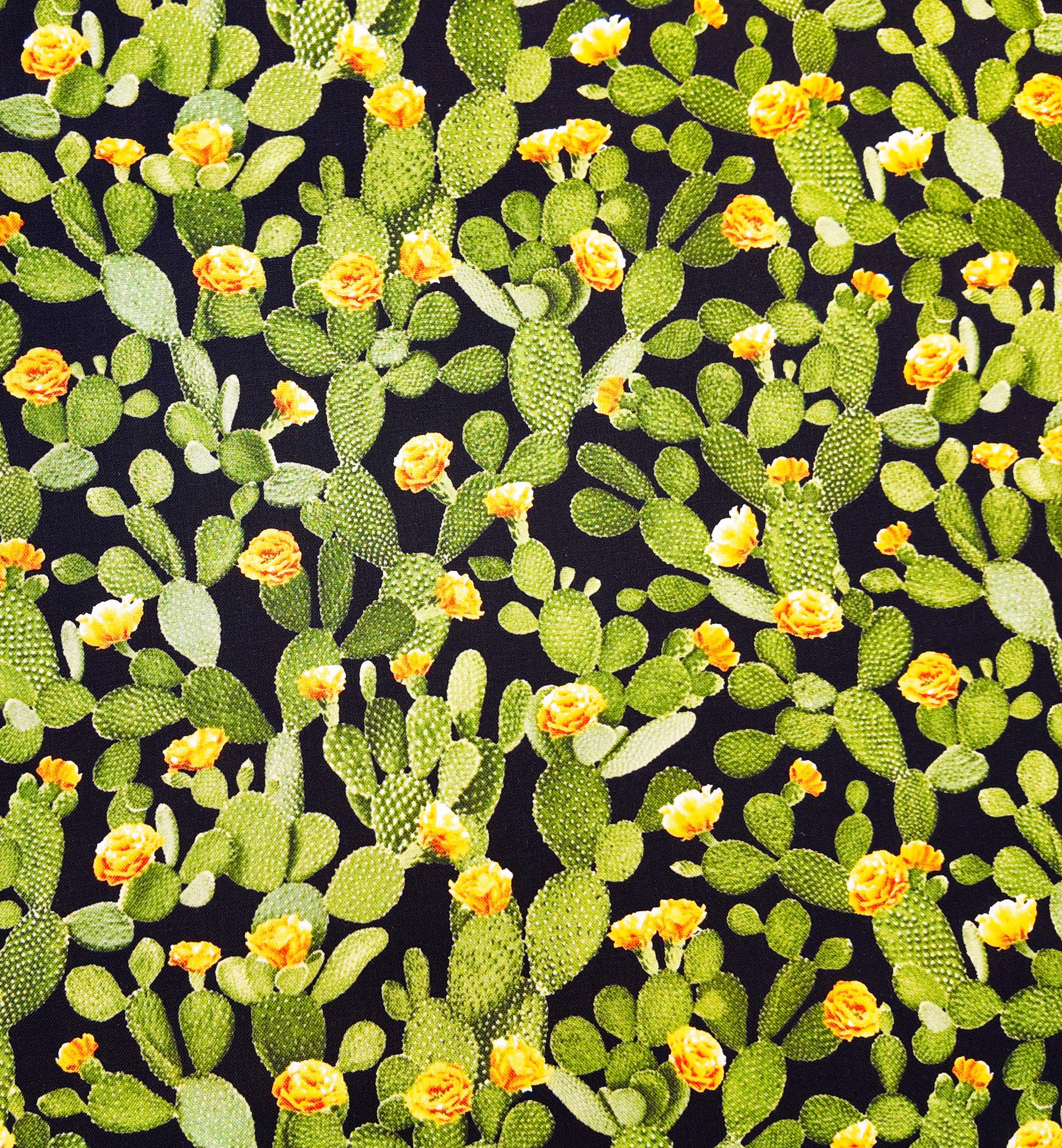 Une forêt de cactus verts s’épanouit sur un fond noir, ornée de fleurs jaunes éclatantes. L’ensemble respire la vitalité du désert, mêlant vigueur végétale et contraste lumineux. Motif moyen et foisonnant.