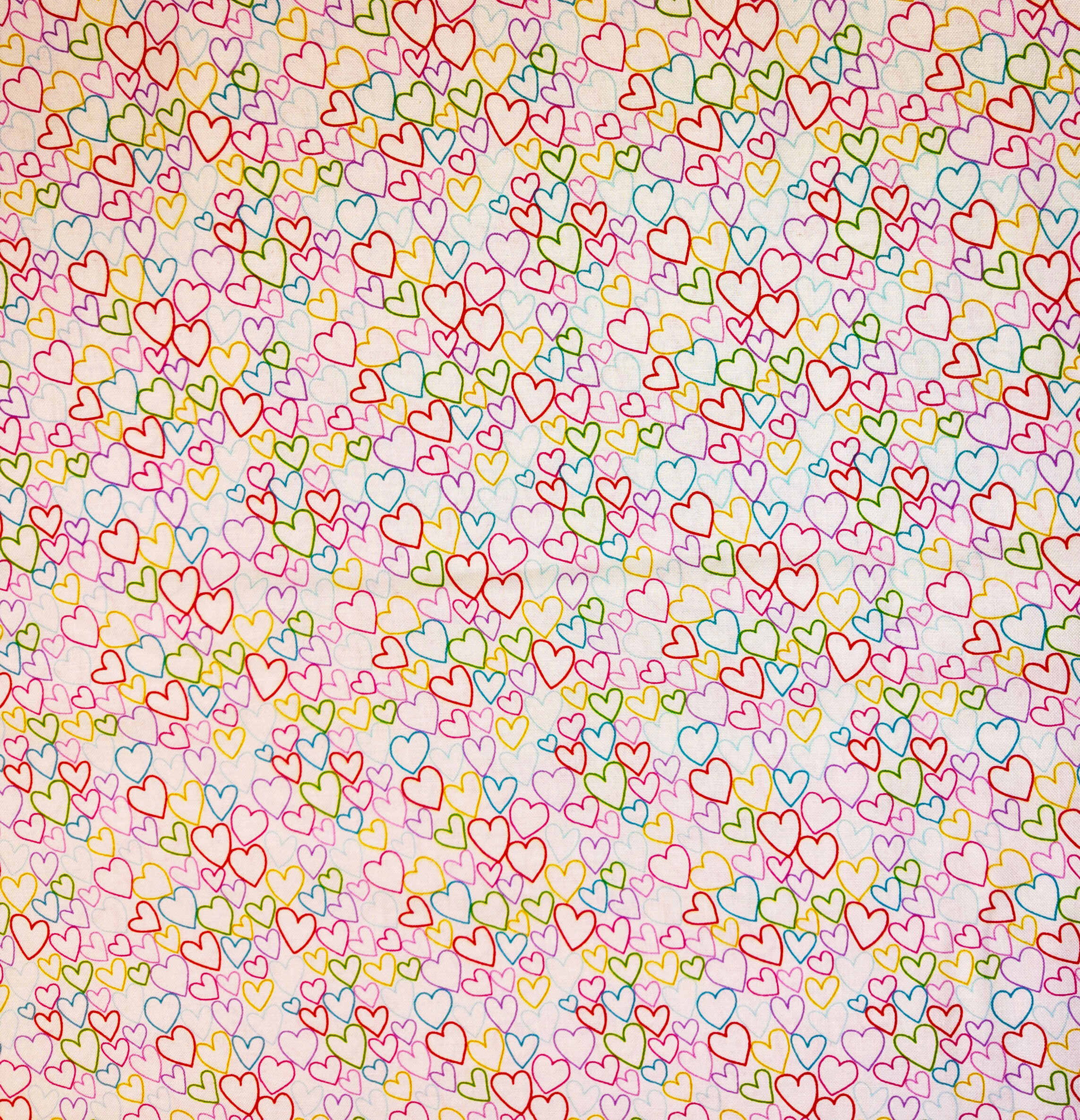 Sur fond blanc, un enchevêtrement de cœurs multicolores forme un réseau joyeux et dynamique. Les contours fins évoquent une légèreté espiègle, entre spontanéité et douceur. Motif petit et continu.