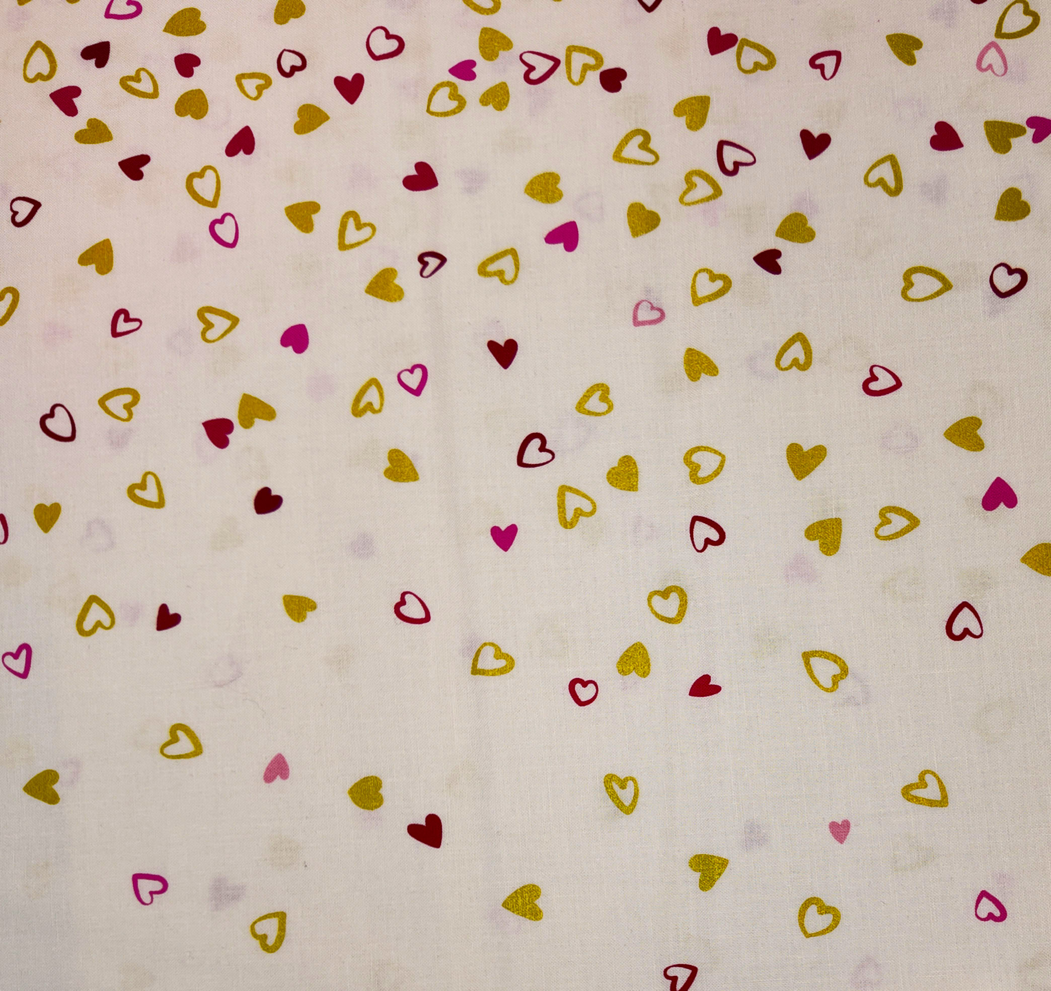 Une pluie de petits cœurs dorés, framboise et rose se dépose sur un fond ivoire clair. Le motif, léger et joyeux, évoque un souffle d’amour discret et aérien. Motif petit et espacé.