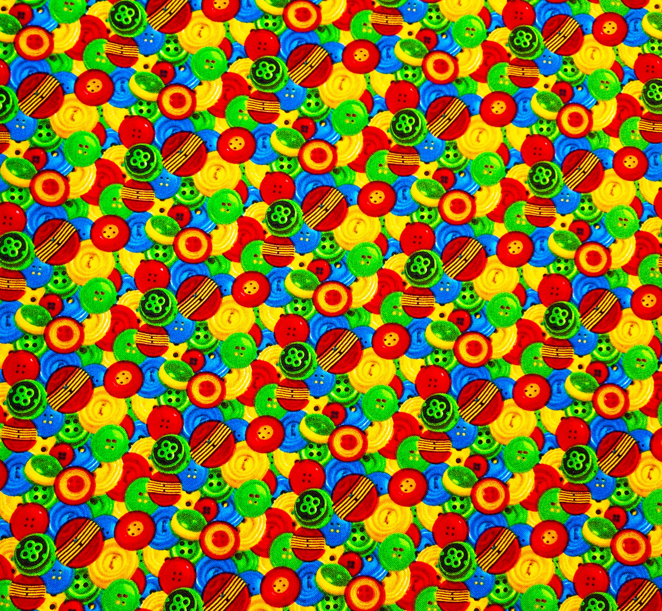 Une mosaïque éclatante de boutons multicolores se superpose dans un joyeux désordre. Rouge, vert, jaune et bleu s’y répondent comme des confettis textiles. Motif petit et vibrant.