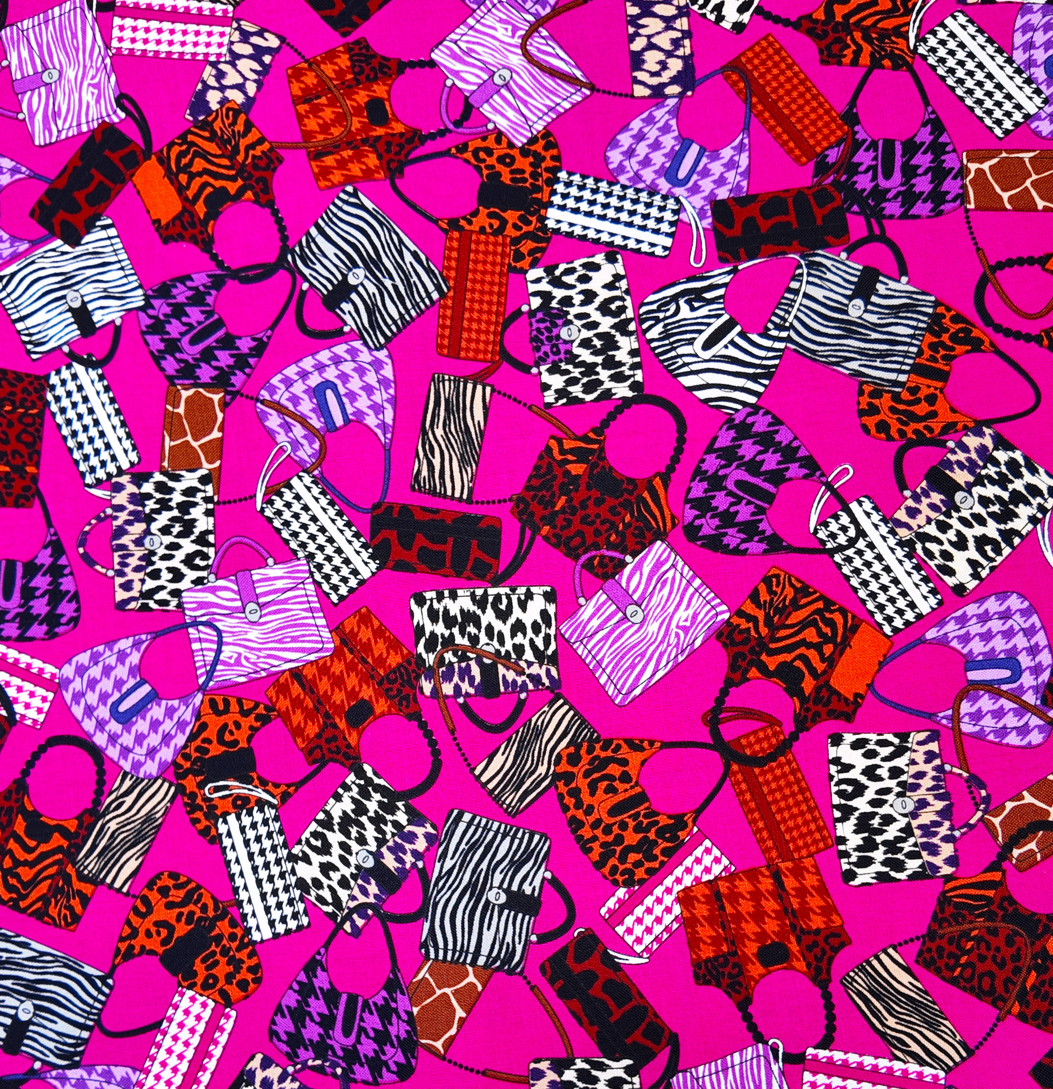 Un fond fuchsia éclatant couvert de sacs à main imprimés de motifs animaliers et graphiques. Le tissu respire la mode audacieuse et l’énergie urbaine. Motif moyen et répétitif.