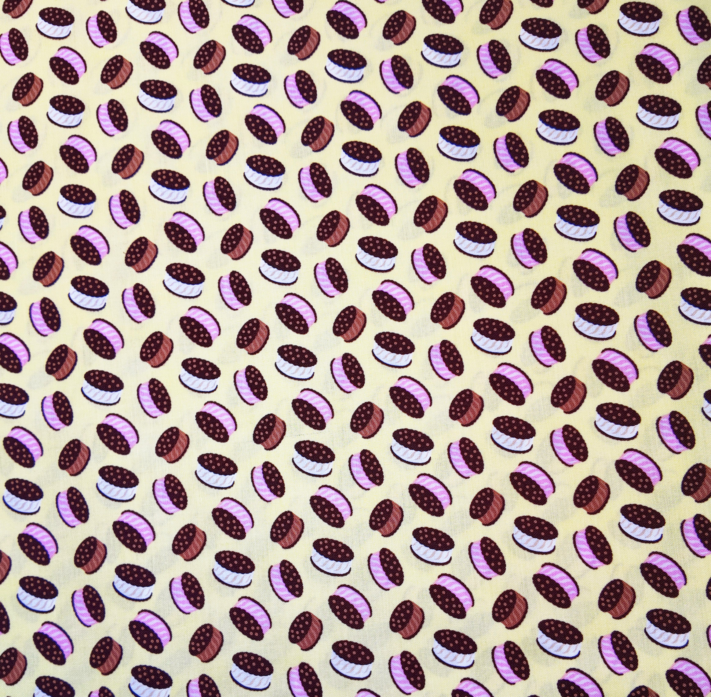 De petits biscuits sandwich chocolat et vanille ou rose s’alignent sur fond jaune doux. Un univers sucré et joyeux se dessine, léger comme une confiserie rétro. Motif petit et régulier.