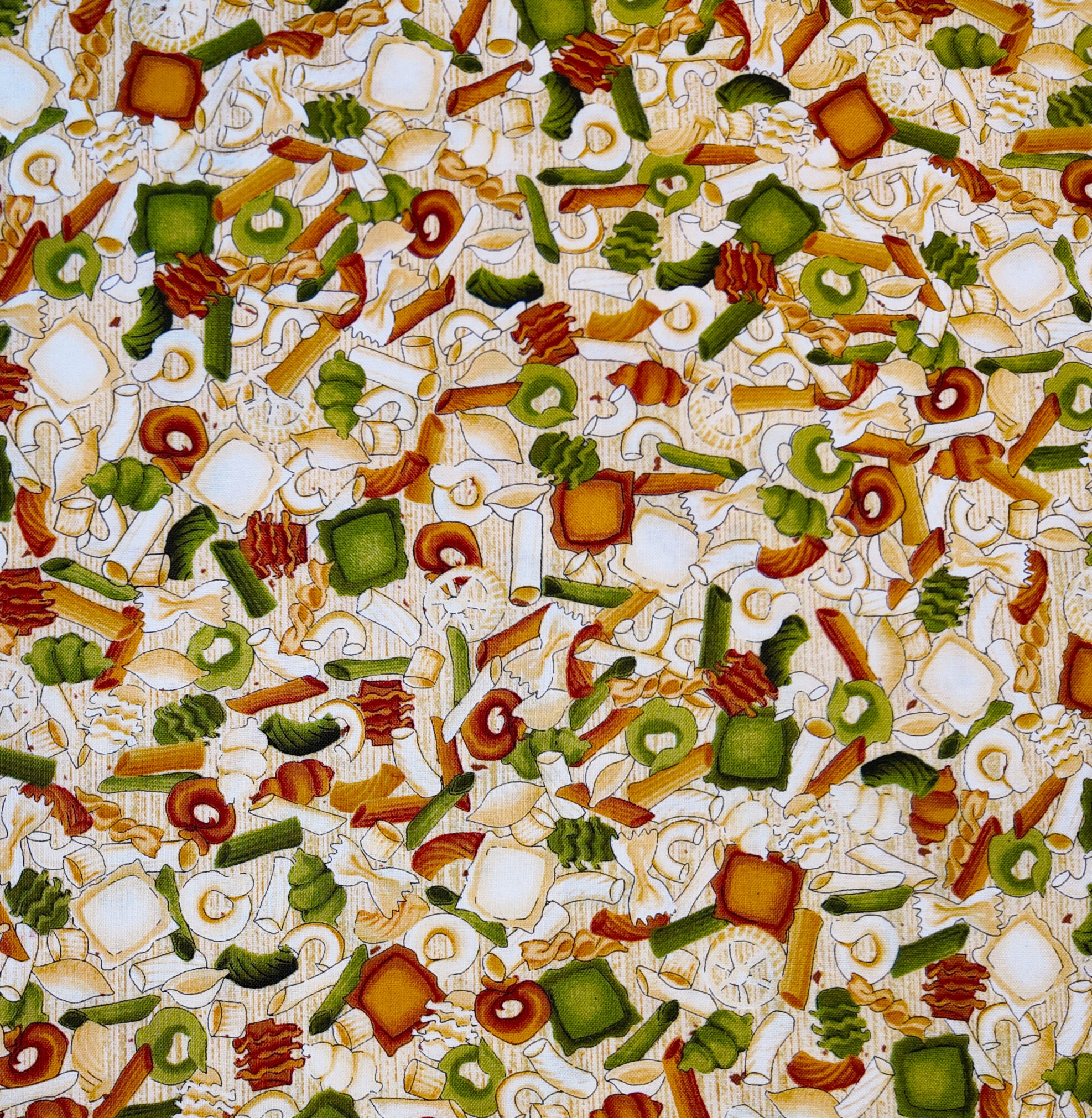 Une pluie de pâtes colorées se mêle sur fond crème : torsades, farfalles et rigatonis en vert, ocre et brun créent un motif joyeux et appétissant. Motif petit et dynamique.