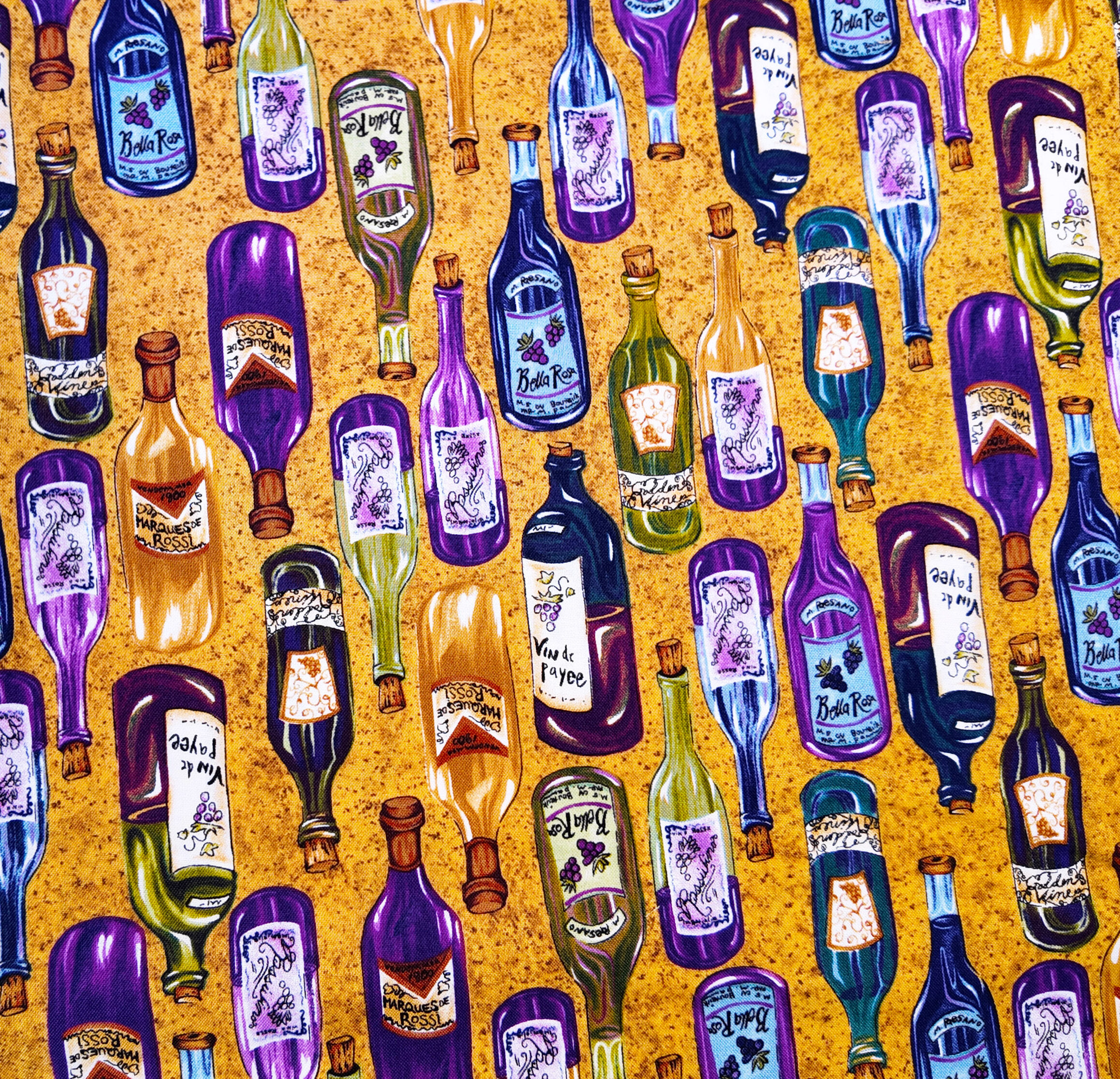 Des bouteilles de vin aux étiquettes variées se dressent sur un fond doré moucheté. Les tons pourpres et verts rappellent une cave ensoleillée aux parfums de terroir. Motif moyen et vertical.