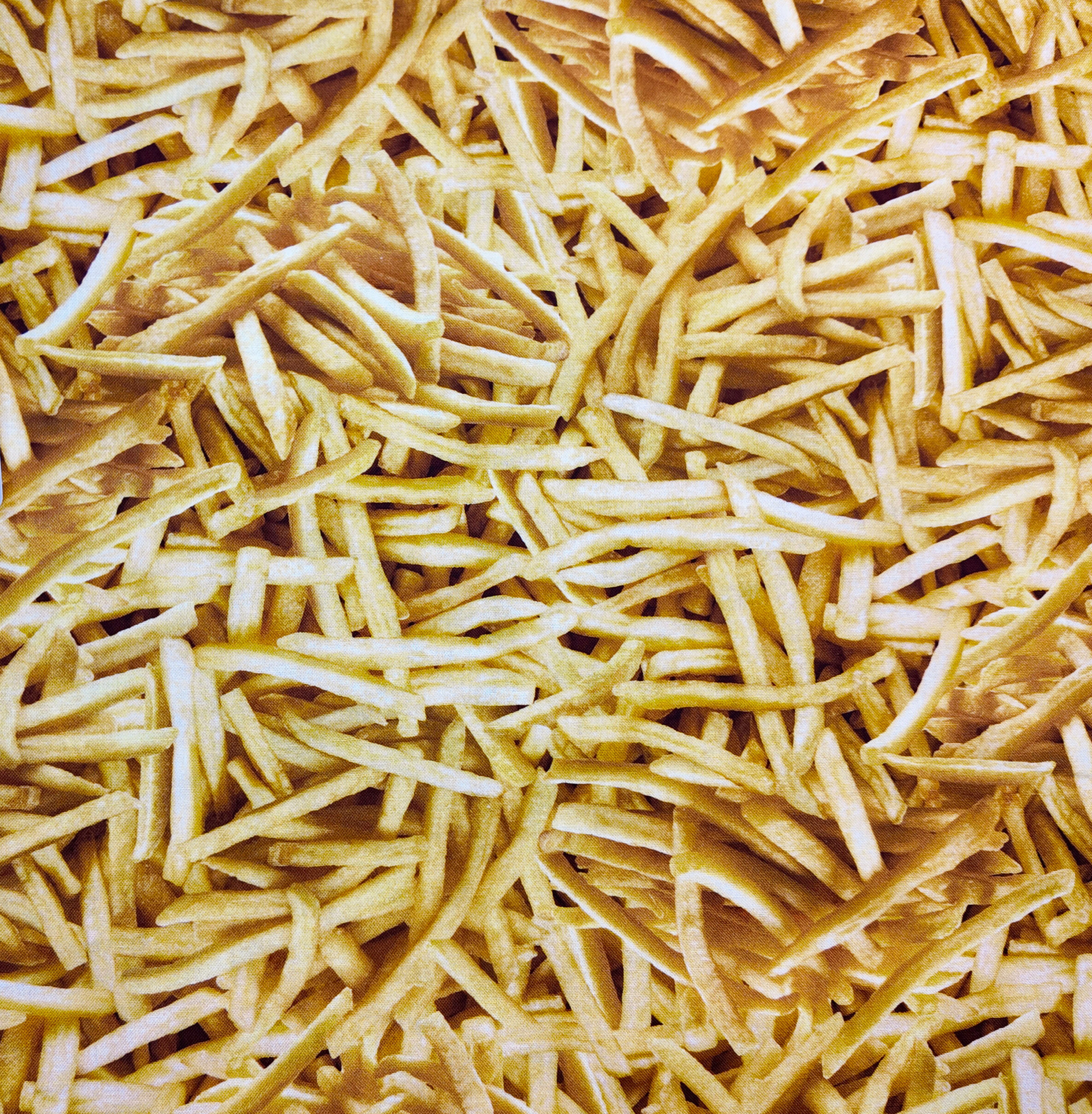 Une surface dorée et lumineuse évoque la chaleur d’un festin convivial : une pluie de frites blondes aux reflets ambrés s’étend à perte de vue. Ce tissu respire la gourmandise et la joie simple des instants partagés autour d’une table.