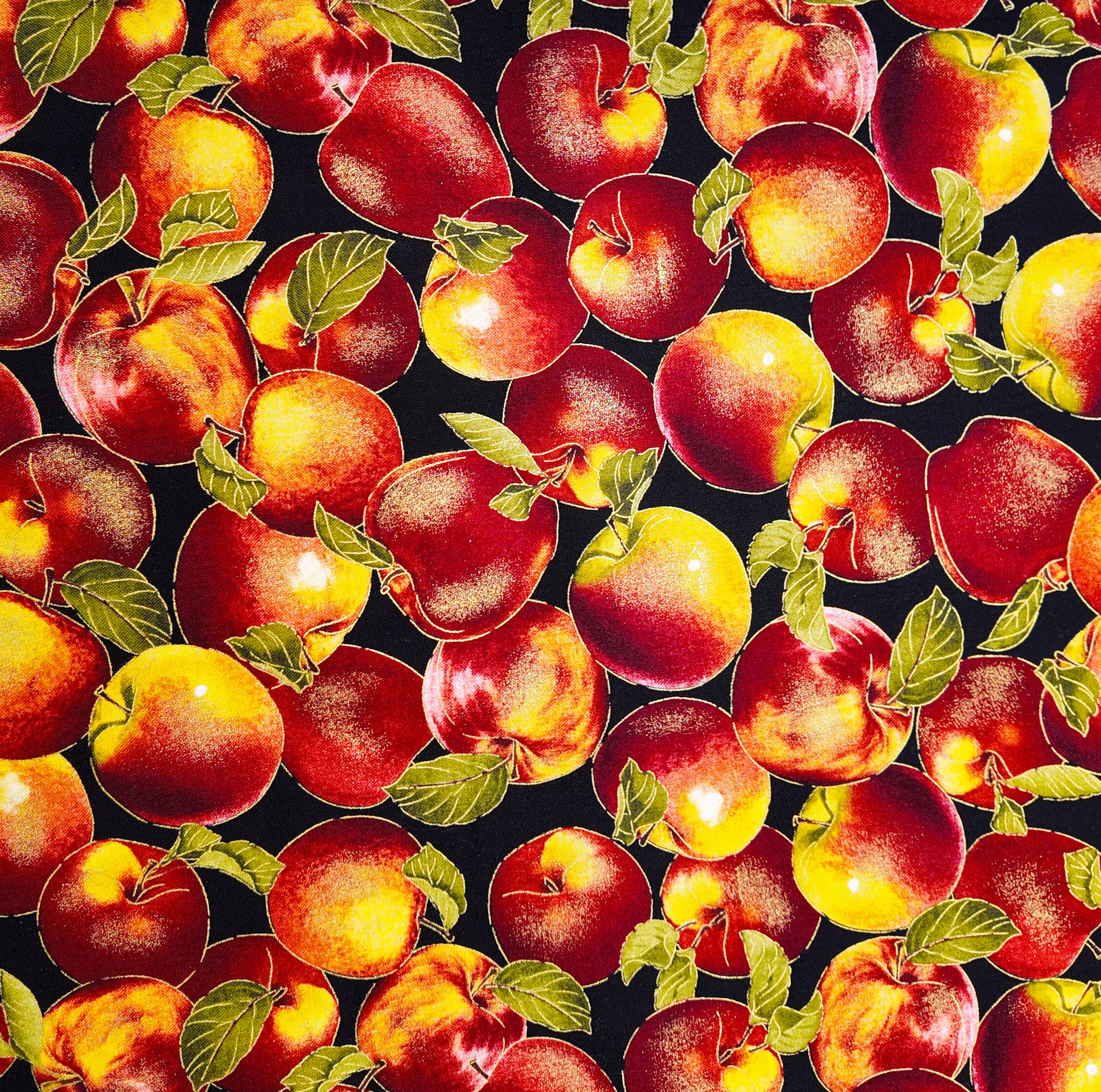 Des pommes rondes et dorées se mêlent au rouge profond des fruits mûrs. Ce tissu rayonne d’un éclat solaire, rappelant les vergers baignés de lumière et la générosité de la saison des récoltes.