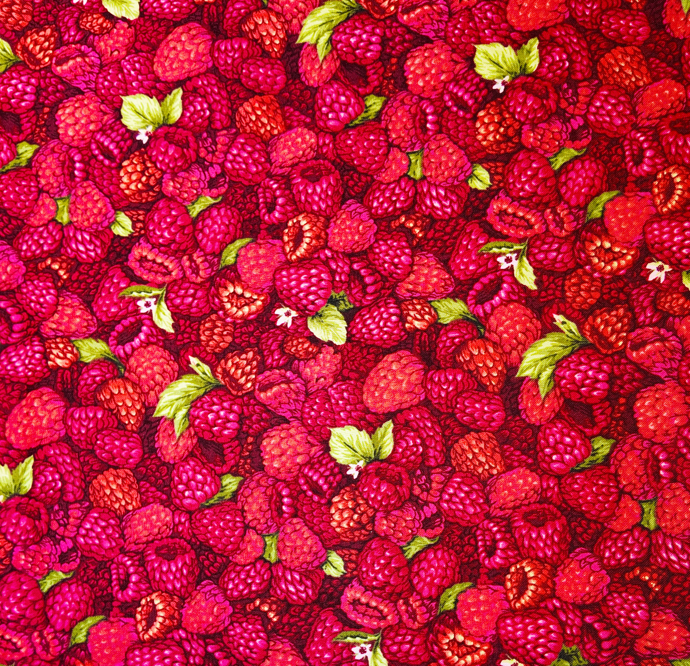 Un champ de framboises gorgées de soleil s’étend sur l’étoffe, mêlant leurs tons carminés à quelques feuilles tendres. Ce tissu célèbre la sensualité et la richesse sucrée des fruits rouges.