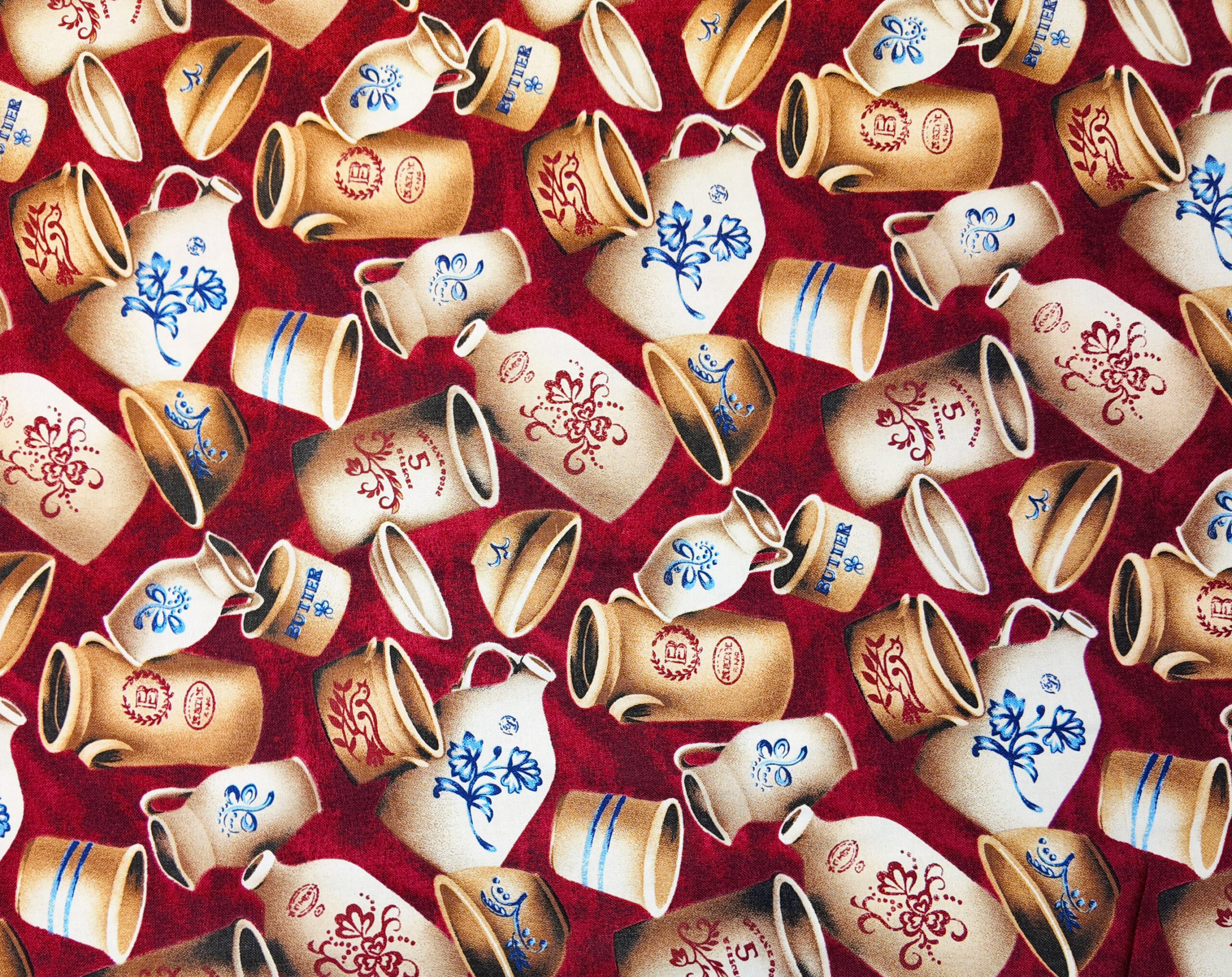 Des pots de grès crème décorés de motifs bleus et rouges se détachent sur un fond rouge profond. Le tissu rappelle les marchés anciens et le charme des poteries d’atelier.