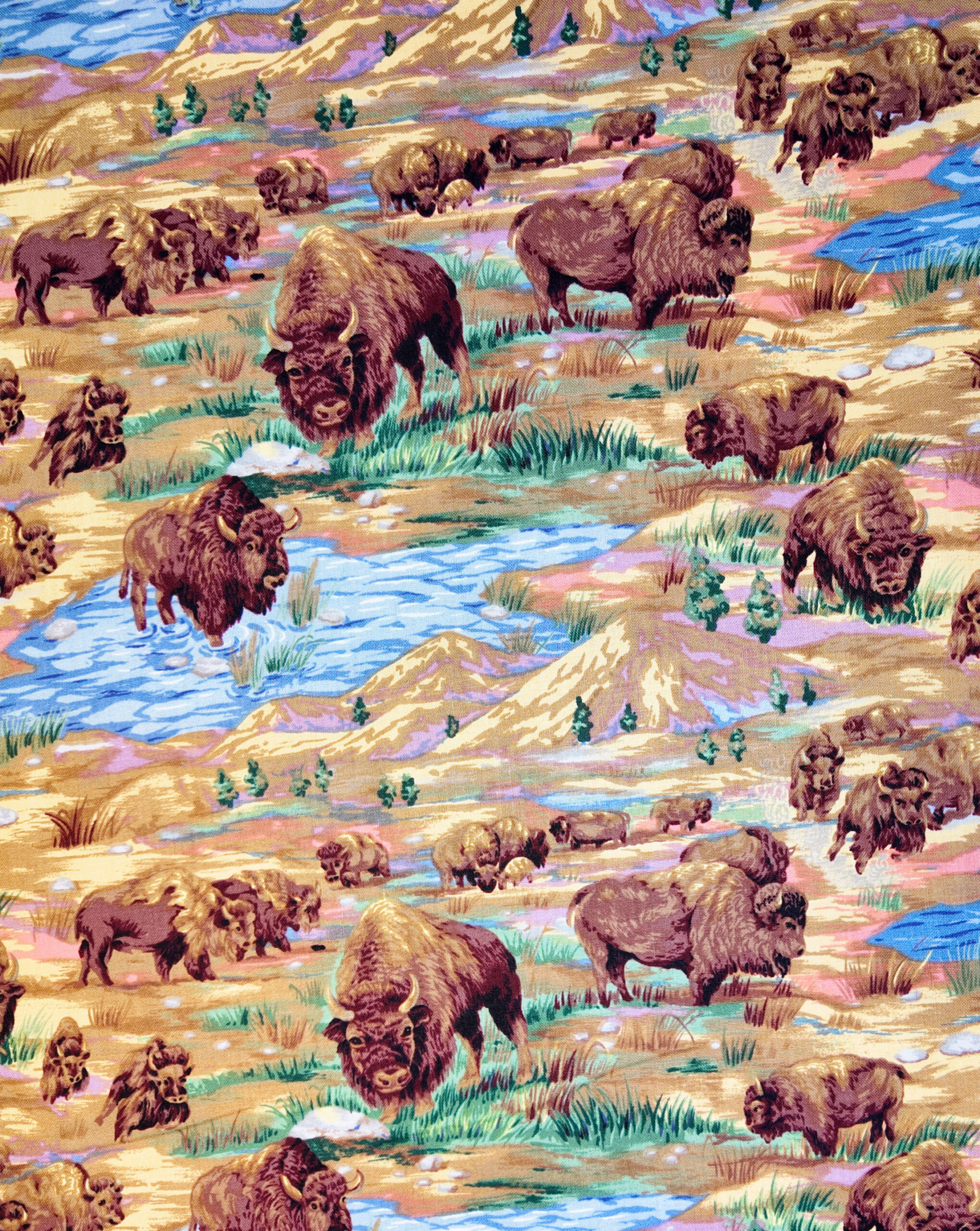 Un troupeau de bisons parcourt des plaines dorées sous un ciel lavande et azur. Le tissu capture la liberté sauvage et la force tranquille des grands espaces de l’Ouest.