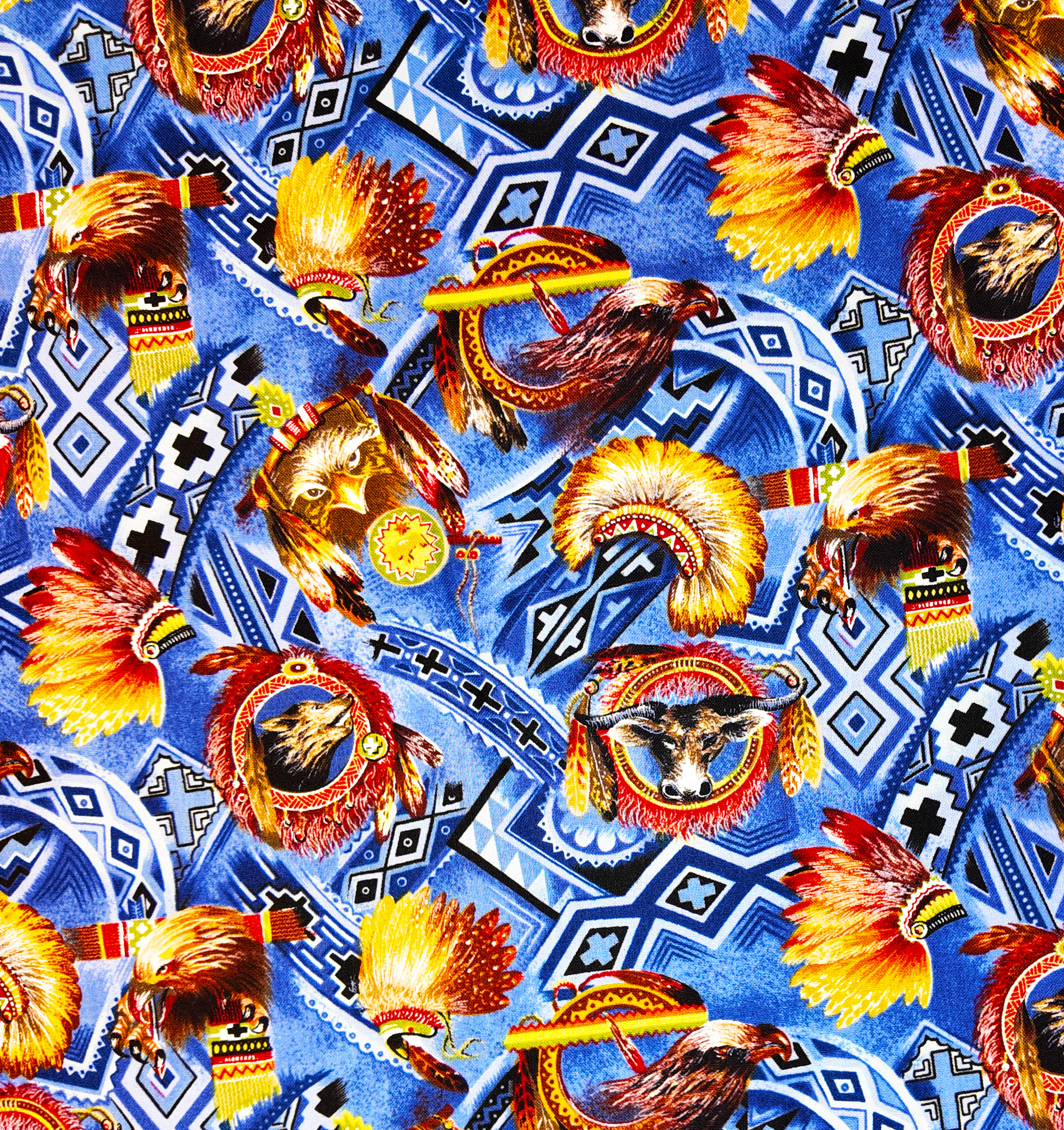 Des coiffes à plumes et symboles tribaux s’entrelacent sur un fond bleu vibrant. Le tissu évoque la puissance des esprits animaux et la noblesse des peuples des grandes plaines.