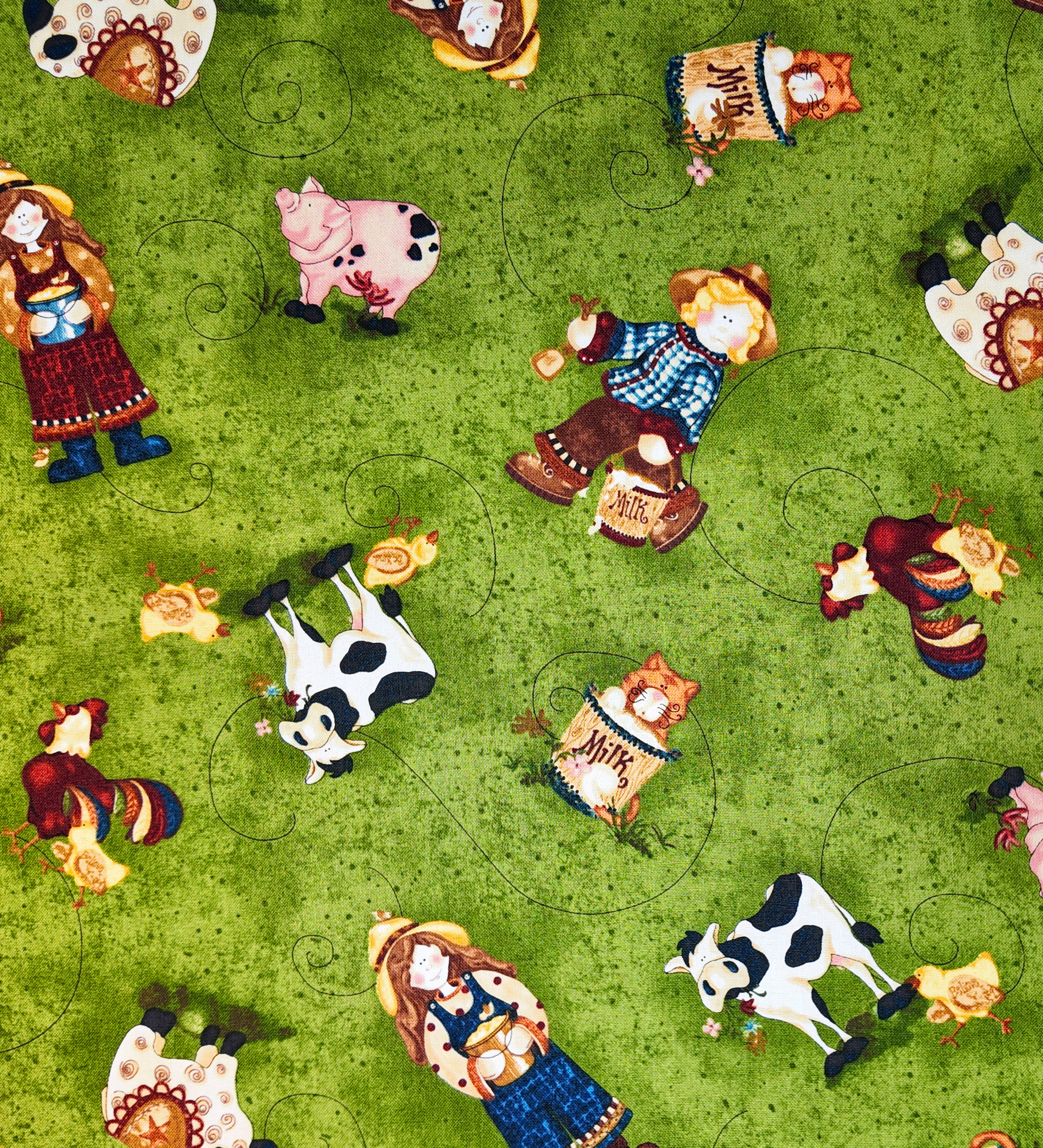 Des scènes champêtres s’éparpillent sur un fond vert tendre : fermiers, animaux et bottes de lait se côtoient joyeusement. Le tissu respire la vie simple et colorée des fermes d’enfance.