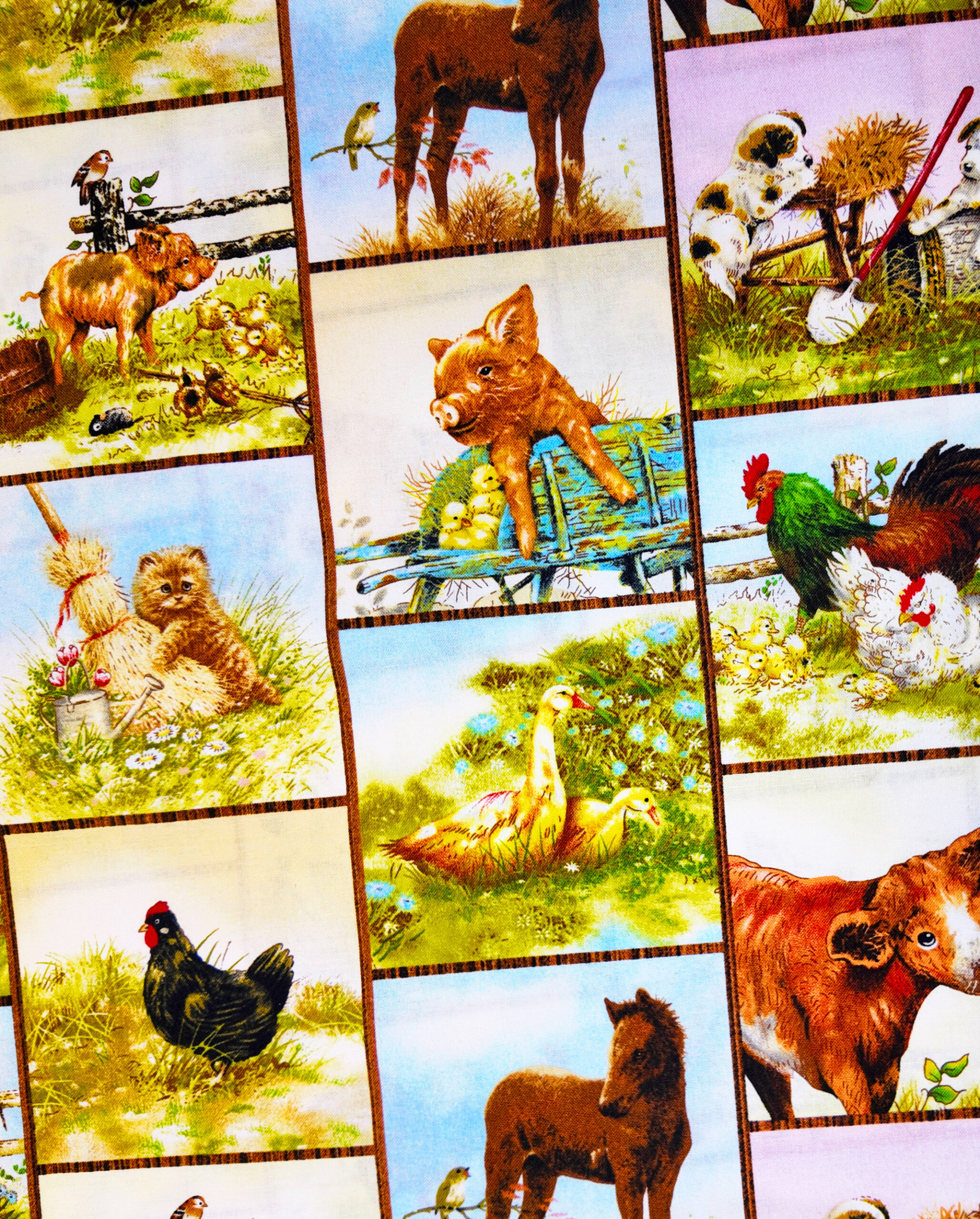 Des vignettes délicates montrent veaux, chatons, poussins et poules sous la lumière des champs. Le tissu respire la tendresse et la douceur du monde animal.