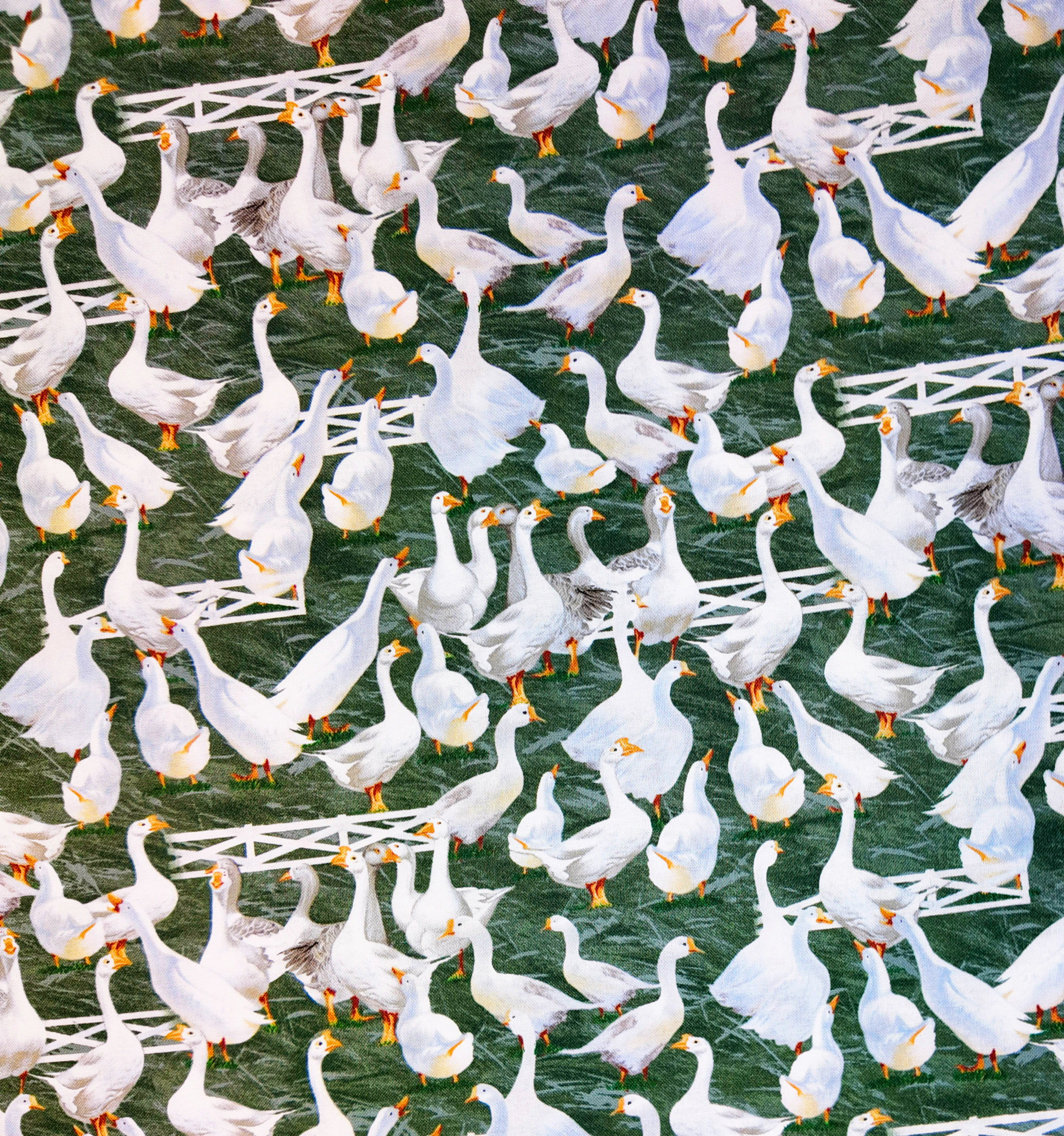 Des oies blanches se promènent en groupe sur un fond vert profond ponctué de barrières blanches. Le tissu dégage une harmonie apaisante et champêtre.