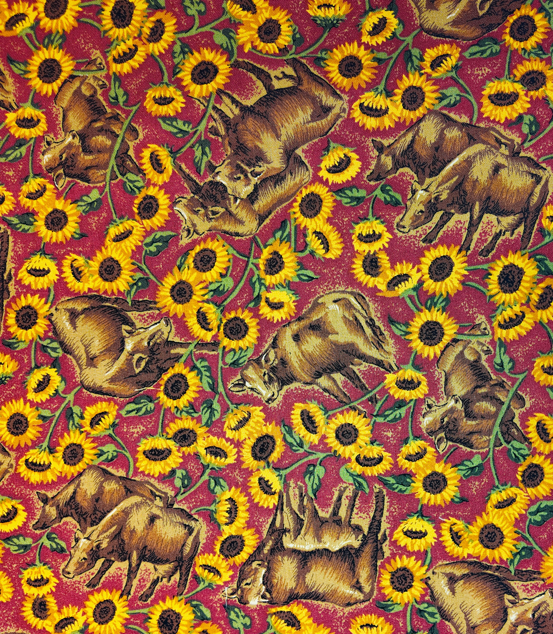 Des vaches brunes paissent parmi un champ éclatant de tournesols sur fond rouge profond. Le tissu rayonne d’une chaleur estivale et d’un parfum de campagne.
