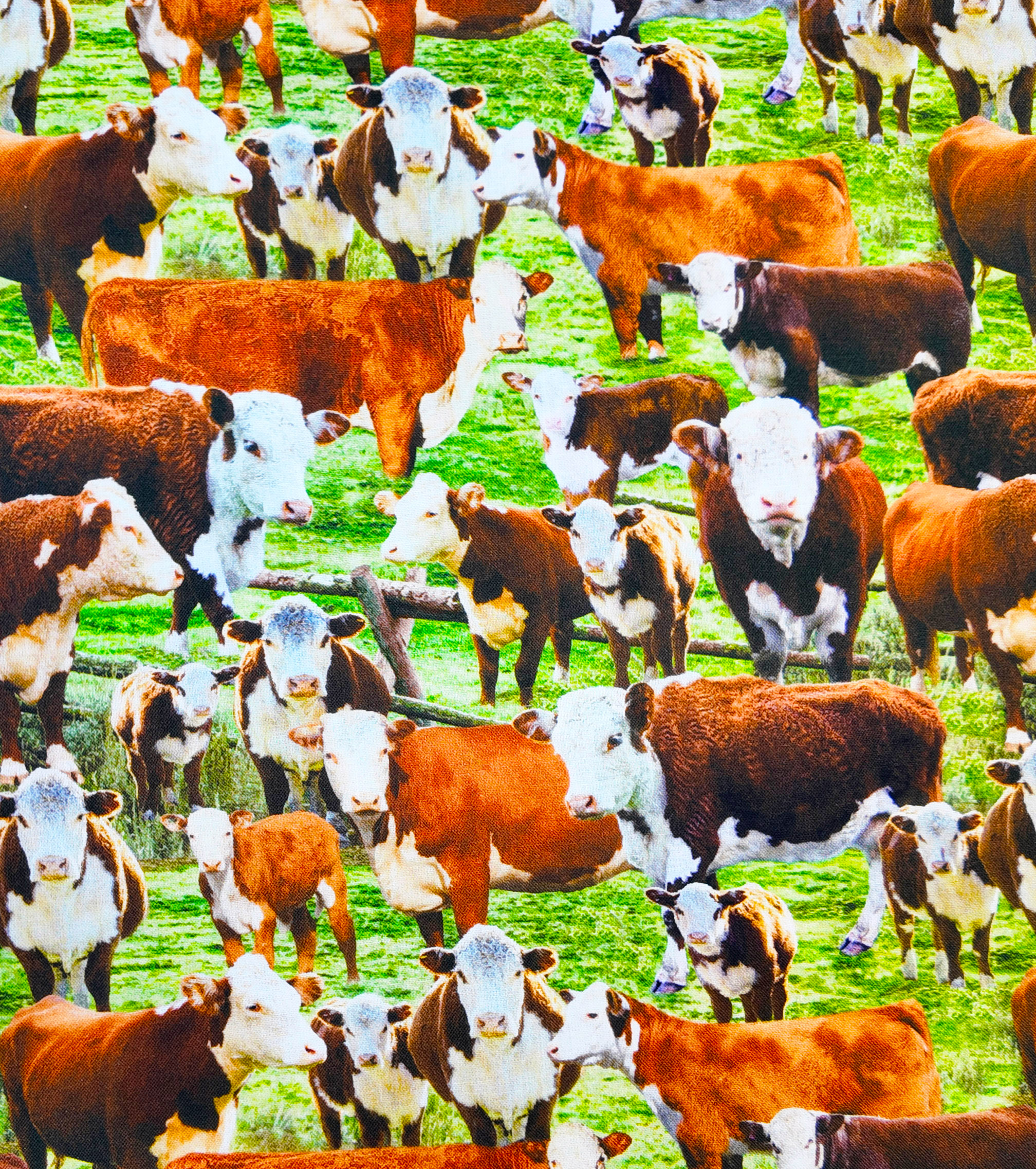 Troupeau de vaches brunes et blanches dans un pâturage lumineux. Le tissu évoque la richesse de la campagne et la quiétude du troupeau.