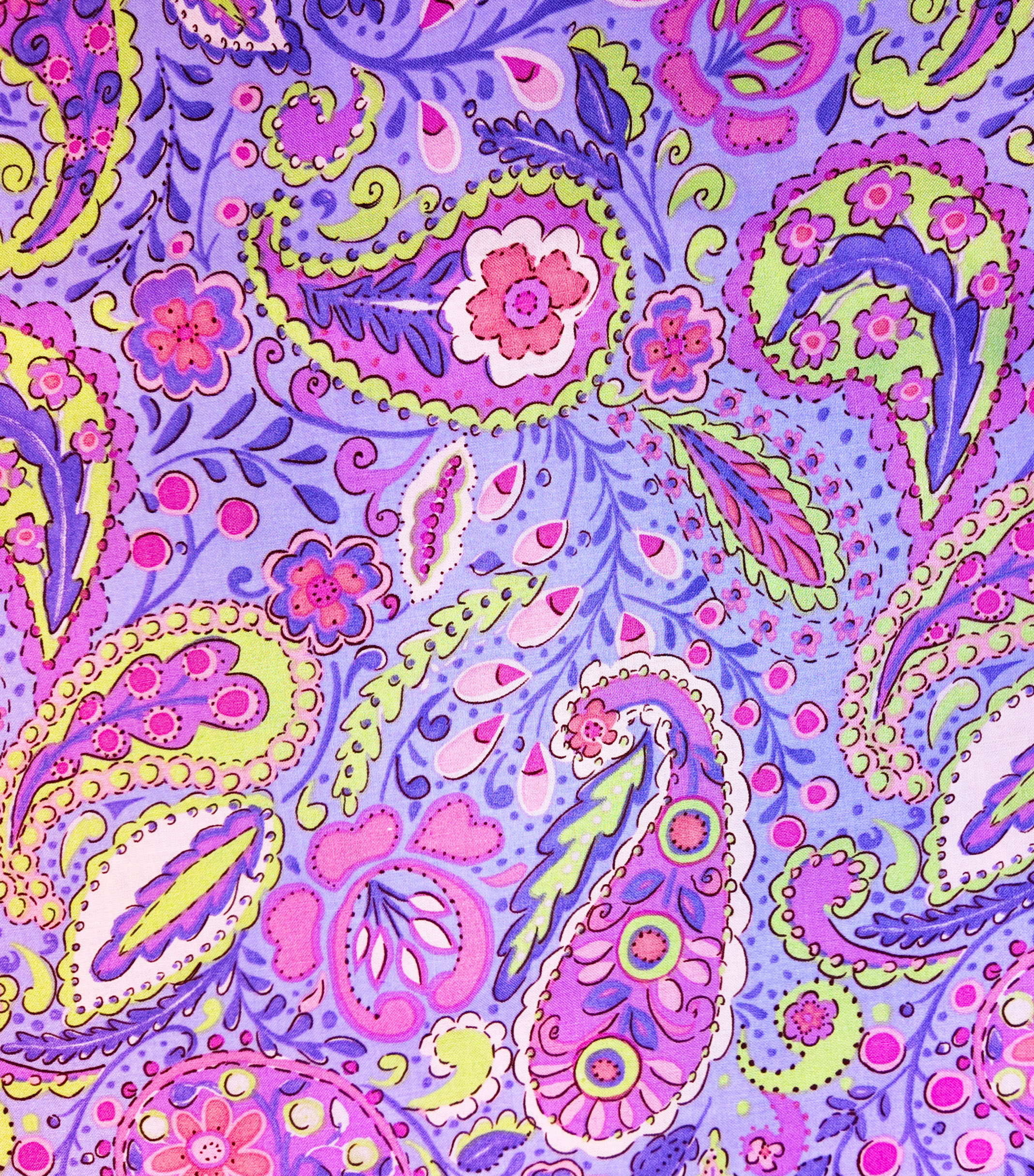 Tourbillon de motifs cachemire aux teintes lilas, rose et vert anis. Le tissu respire la fantaisie et la fraîcheur d’un printemps lumineux.