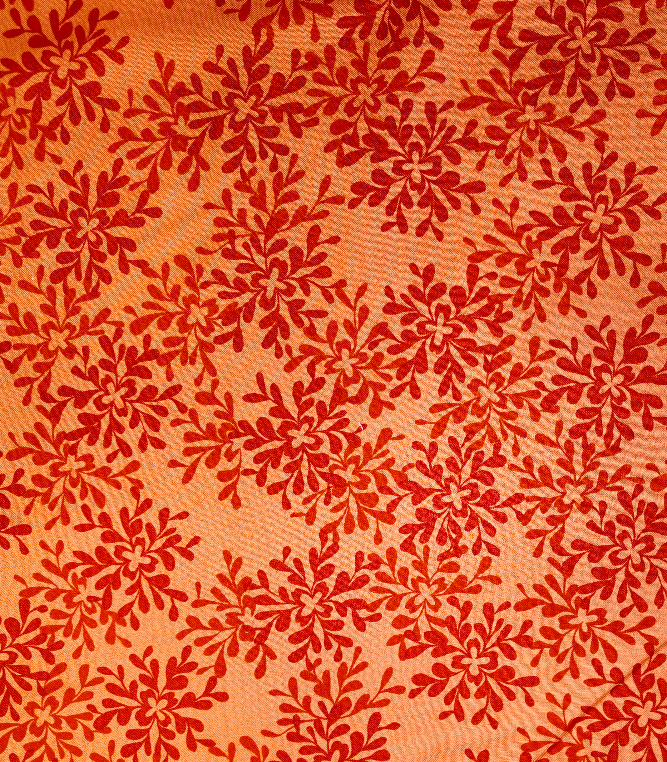 Des fleurs rouges s’ouvrent sur un fond ocre profond, vibrant d’intensité. Le tissu respire la passion et la force d’une fin de journée flamboyante.