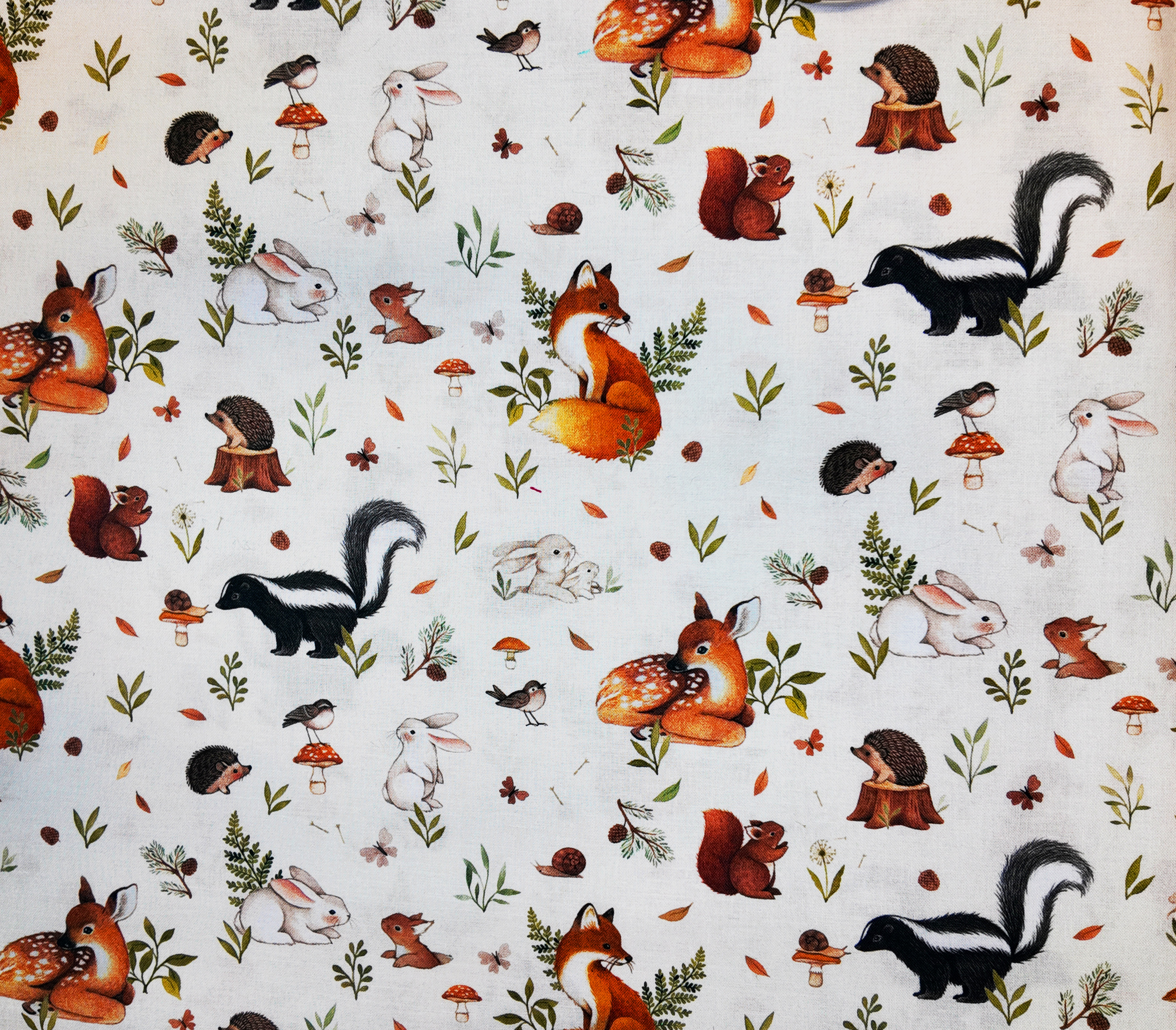 Une scène douce peuplée de faune forestière se déploie sur un fond ivoire, mêlant feuillages, animaux et sous-bois dans une atmosphère narrative et chaleureuse.