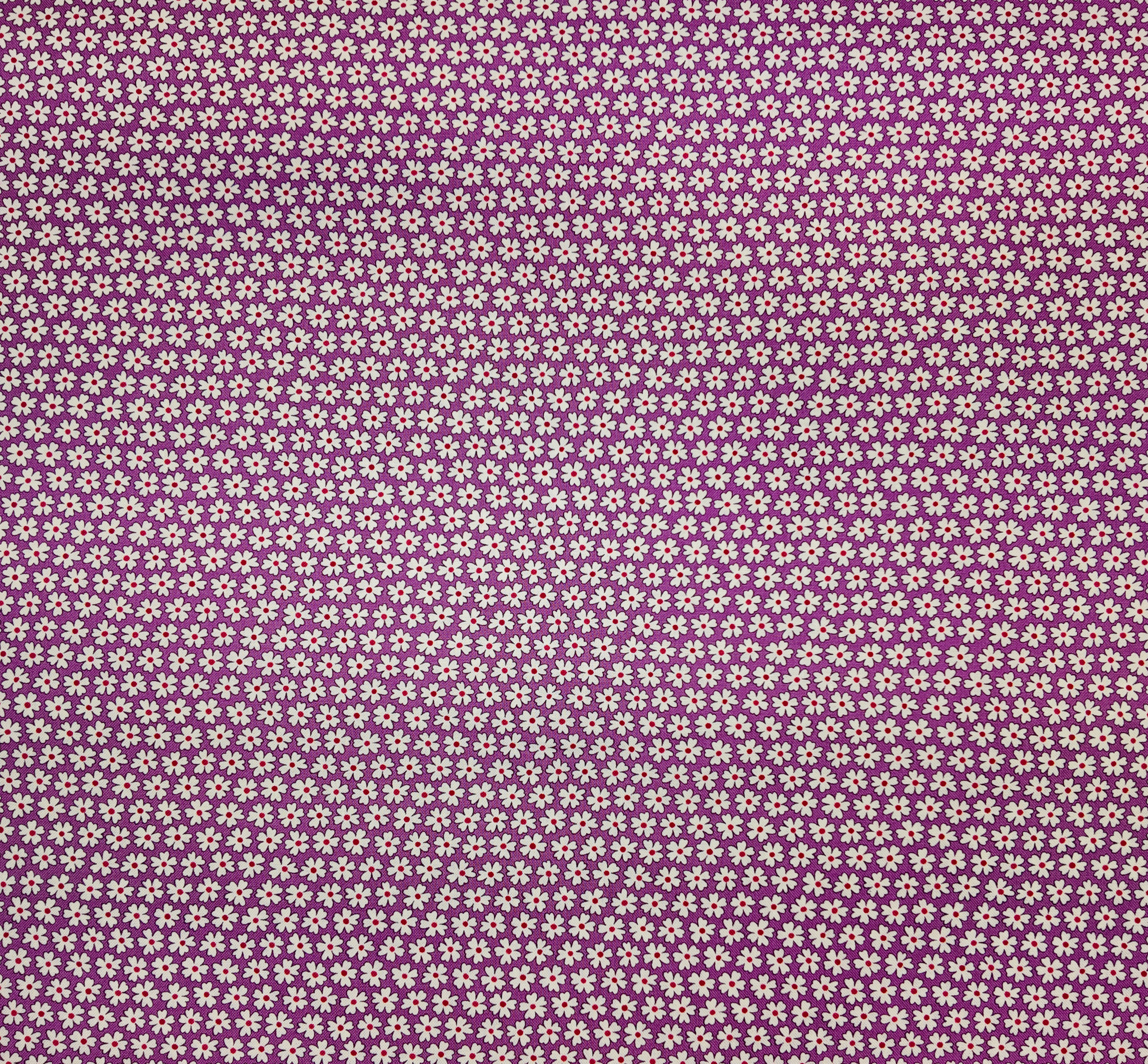 Une pluie régulière de petites fleurs blanches au cœur rosé se déploie sur un fond framboise, créant une surface vibrante et joyeuse, pleine d’énergie et de fraîcheur.