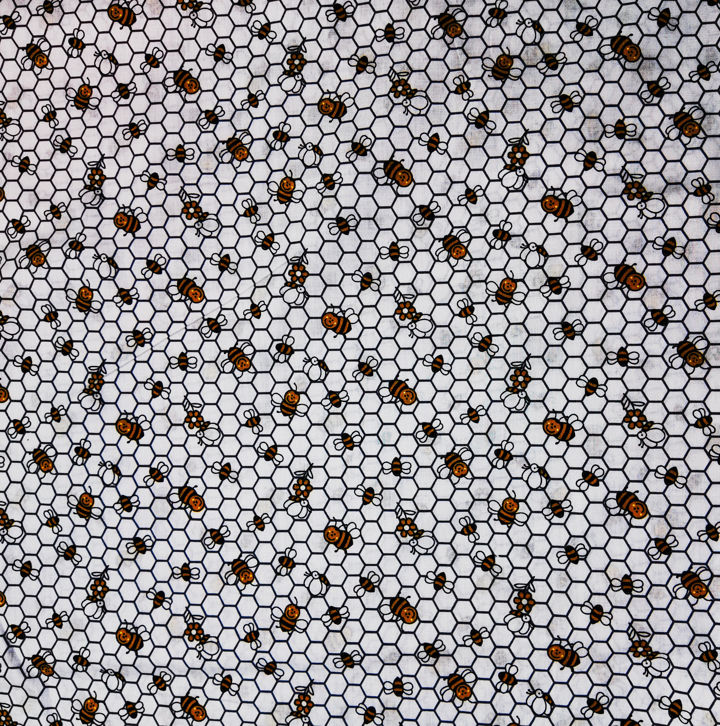 Un voile lumineux parcouru de petites abeilles dorées qui butinent entre des alvéoles fines. Le fond clair fait ressortir leurs silhouettes vibrantes dans une atmosphère joyeuse et ensoleillée.