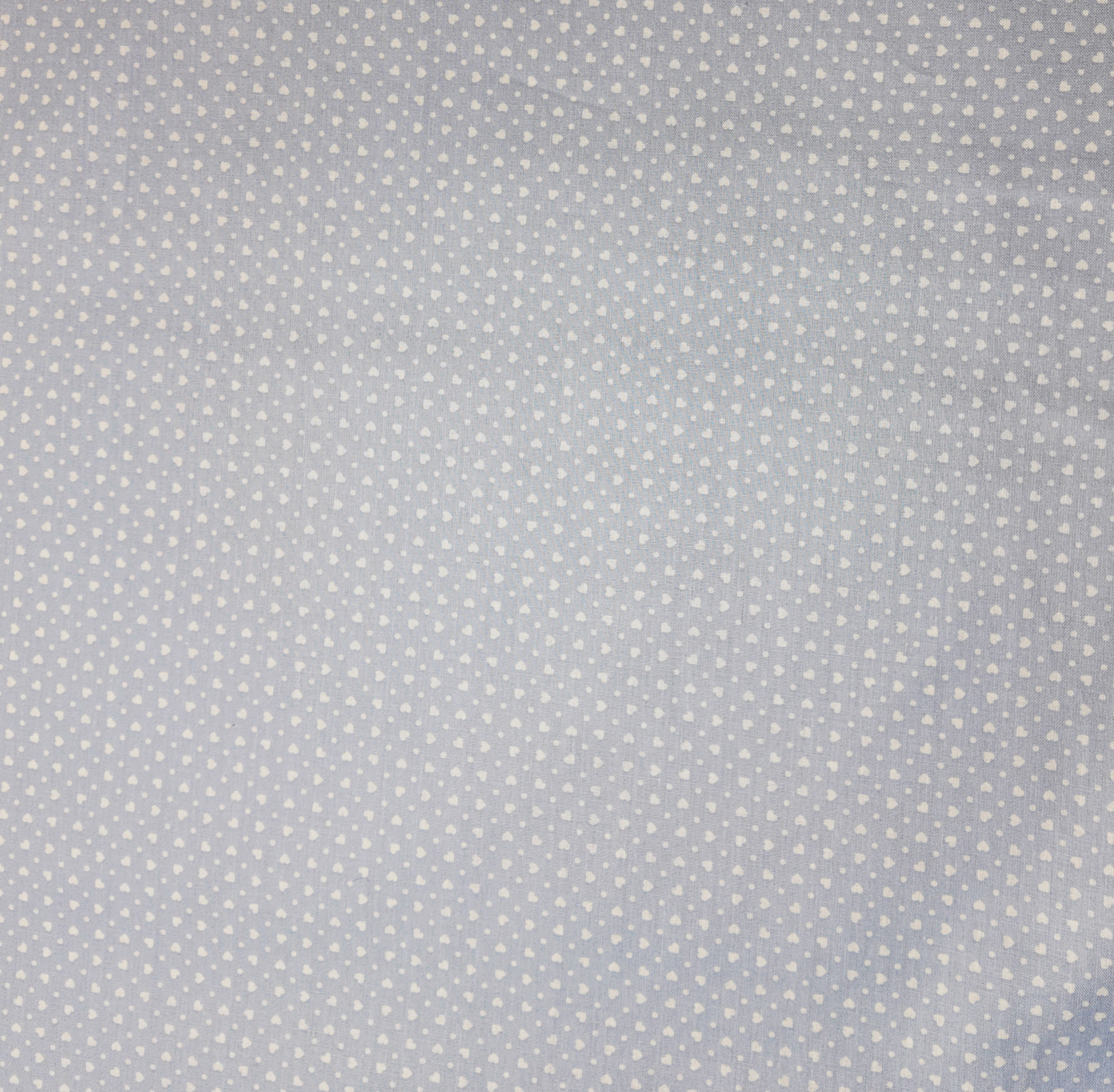 Une mer douce de gris pâle accueille une pluie régulière de petits pois blancs, donnant une impression de légèreté aérienne. Le motif s’installe dans une harmonie calme et sereine.