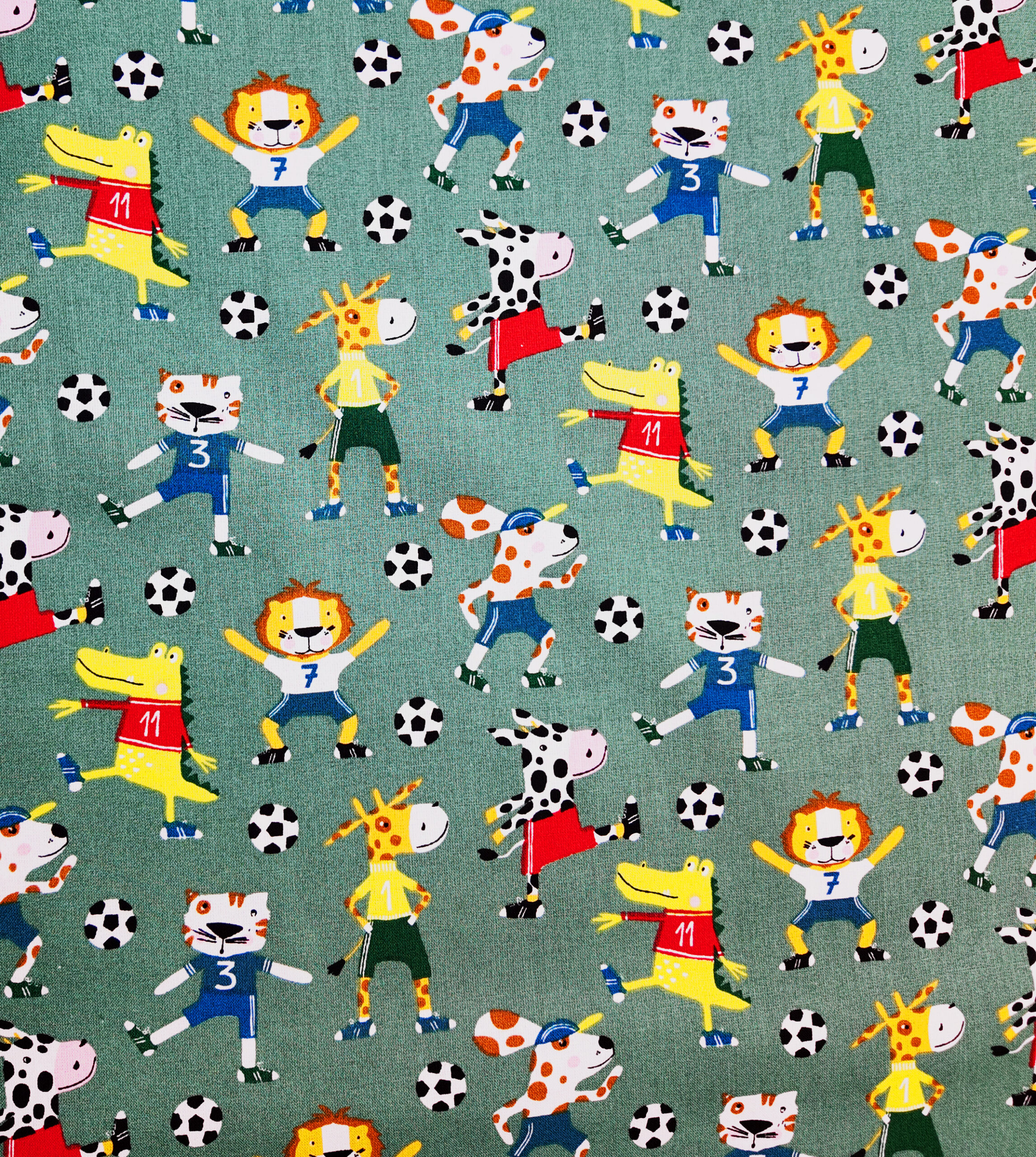 Une scène joyeuse où des animaux stylisés s’élancent dans un match improvisé, rythmée par des ballons qui flottent sur un fond vert doux, créant une atmosphère ludique et dynamique.