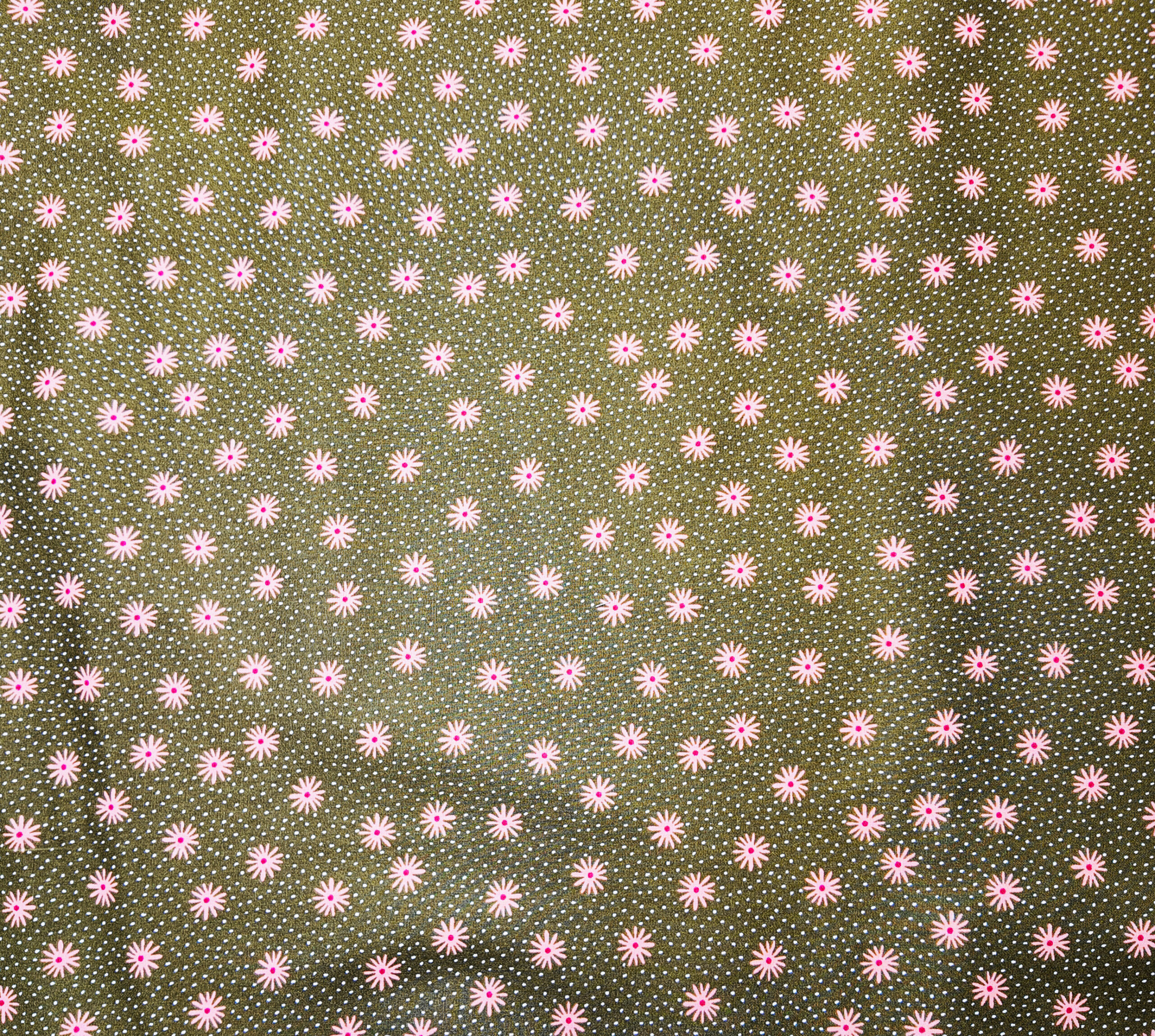 Une pluie de petites fleurs rosées éclaire un fond vert profond constellé de micro-points, donnant une sensation végétale vive et régulière.