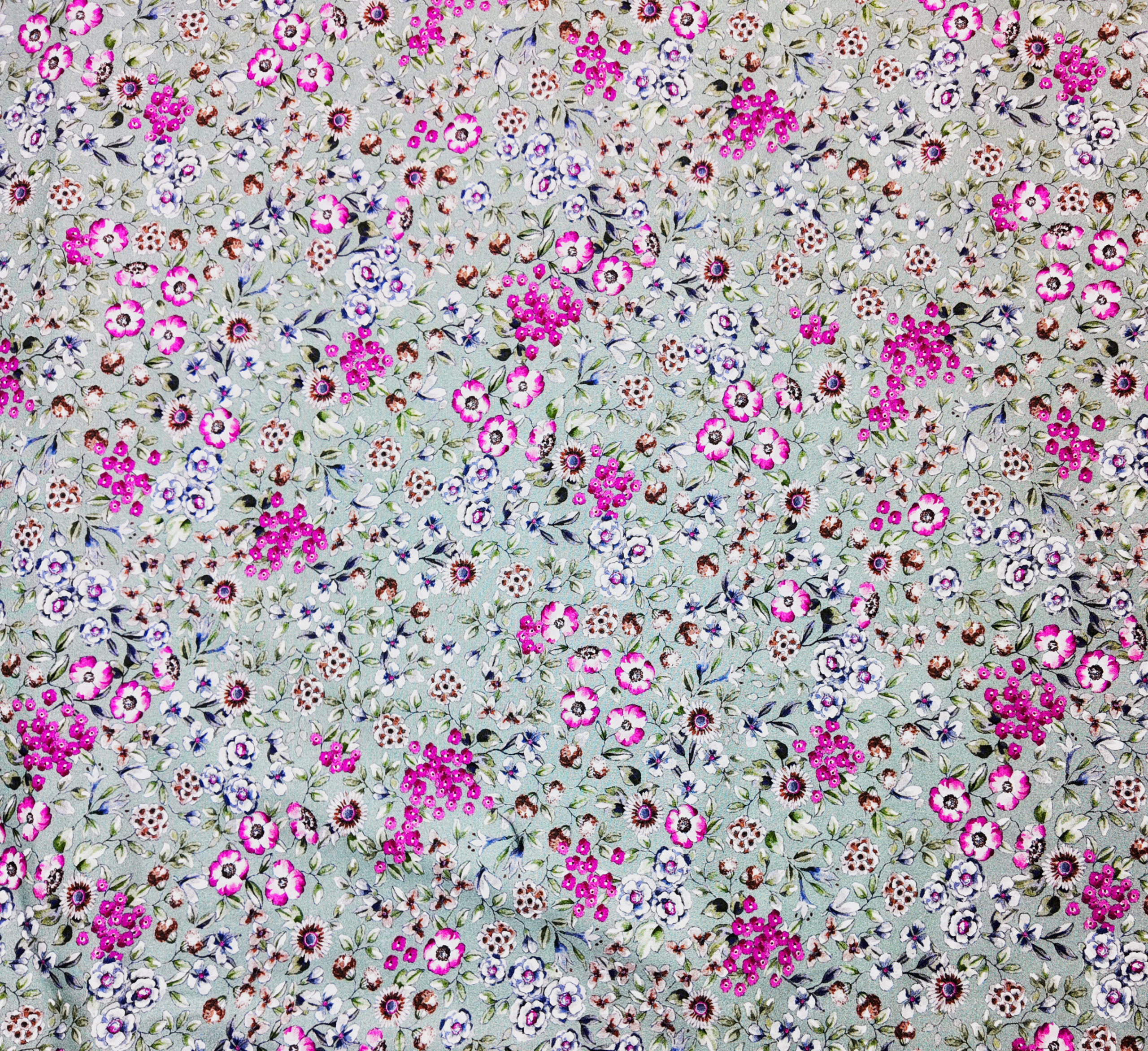 Une constellation florale mêlant roses fuchsia, pétales ivoire et feuillages nuancés se déploie sur un fond gris doux, offrant une ambiance raffinée, vivante et délicatement printanière.