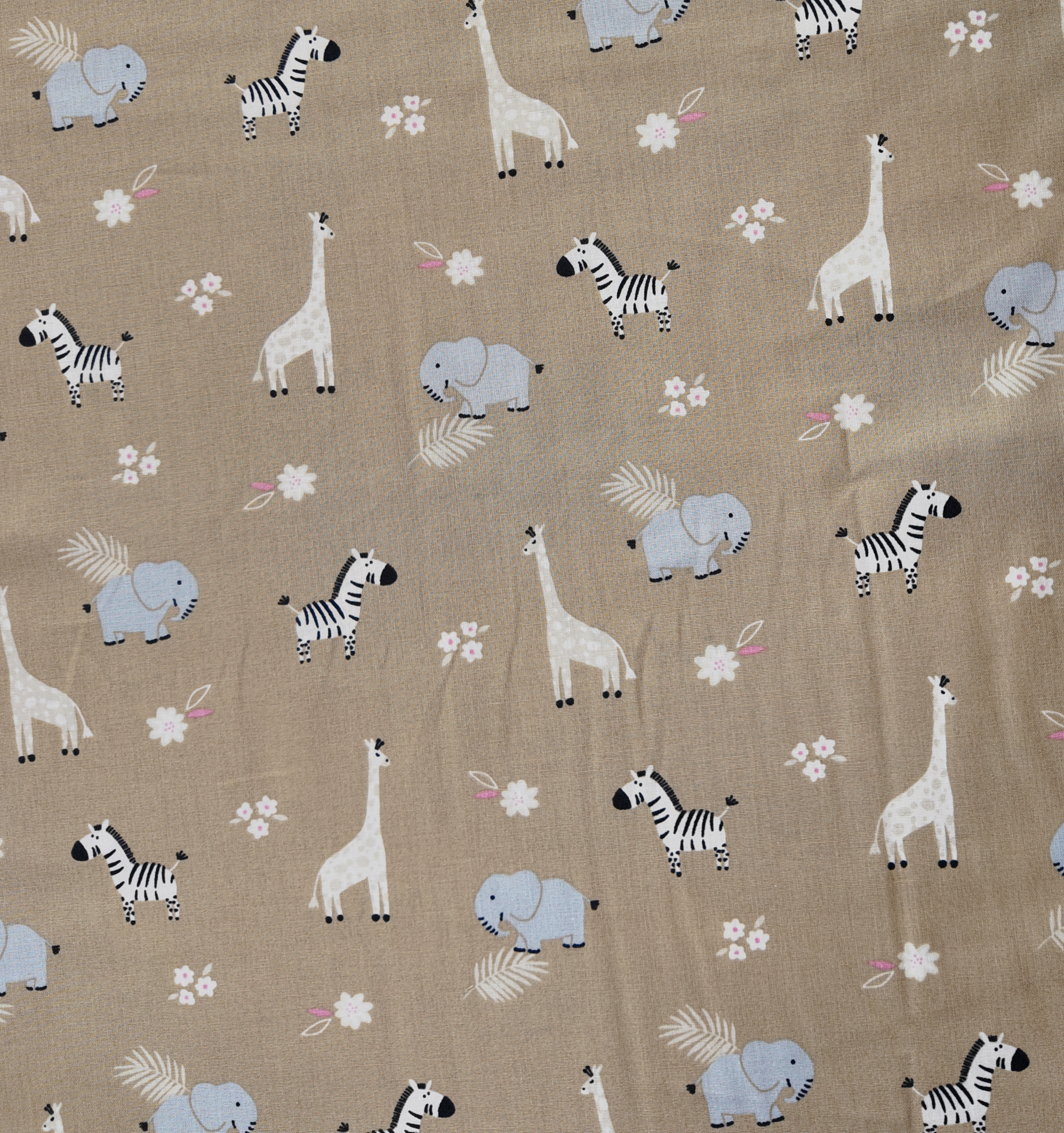 un fond beige doux sert de scène à des girafes élancées, des éléphants souriants et des zèbres légers, parsemés de petites fleurs pastels.