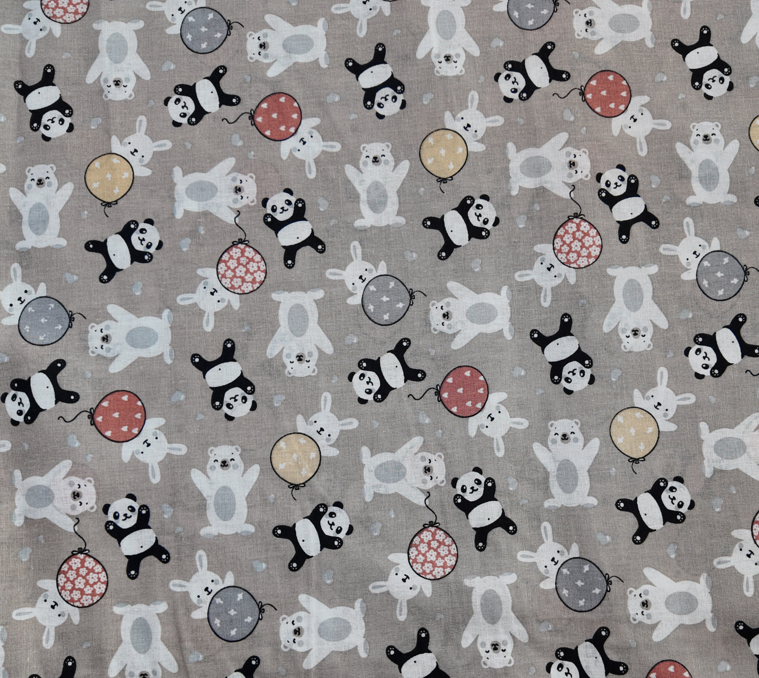 de petits pandas noirs et blancs et des lapins pâles jouent parmi des ballons colorés sur un fond taupe tendre, créant une atmosphère joyeuse et enfantine.