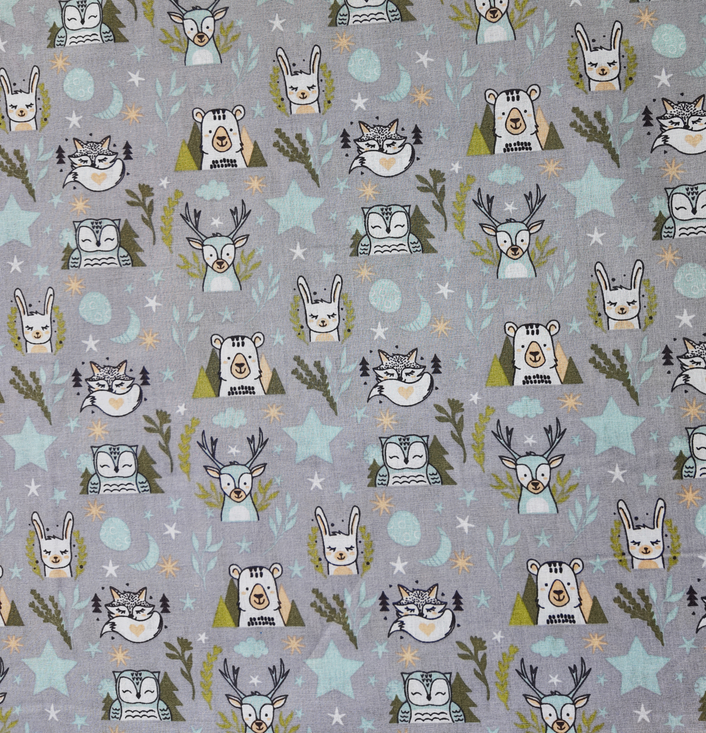 une fresque de petits animaux de la forêt, posés sous une voûte de lunes et d’étoiles poudrées, dans une ambiance douce et rêveuse aux teintes grises et menthe.
