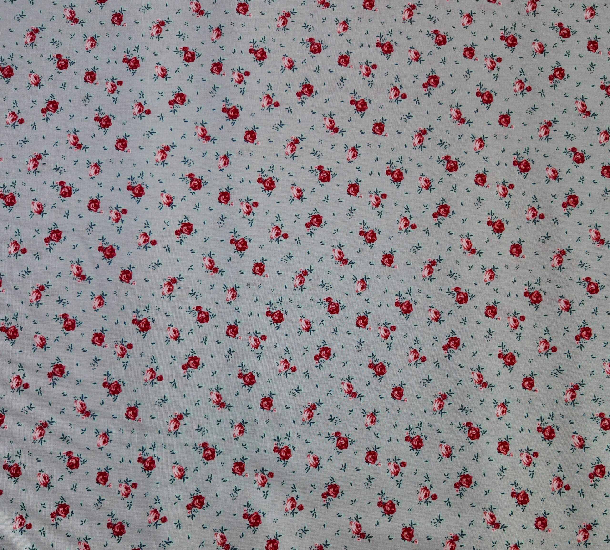 Petites roses rouge vif ponctuant un voile gris clair, comme un jardin miniature tapissé de feuillages délicats. Un motif régulier qui évoque la légèreté d’un imprimé vintage.
