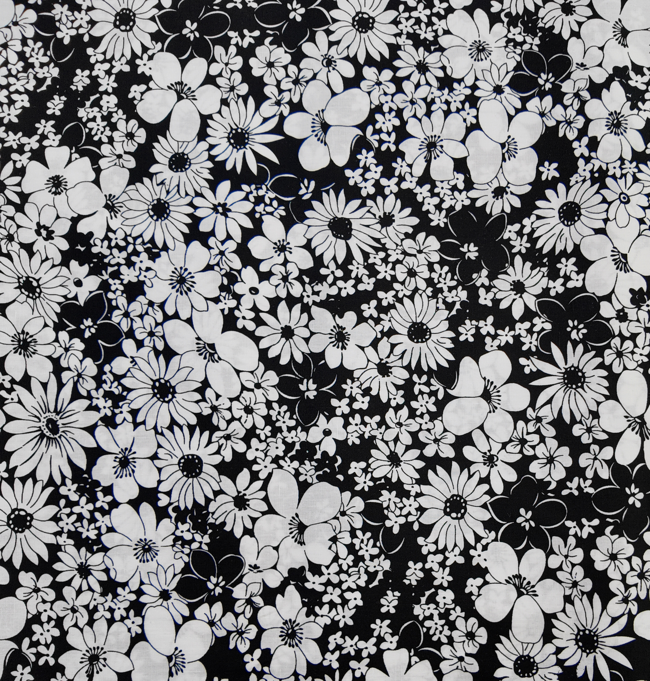 Une mosaïque florale noir et blanc où se mêlent pétales et silhouettes végétales, créant un jardin graphique éclatant dans un contraste profond.
